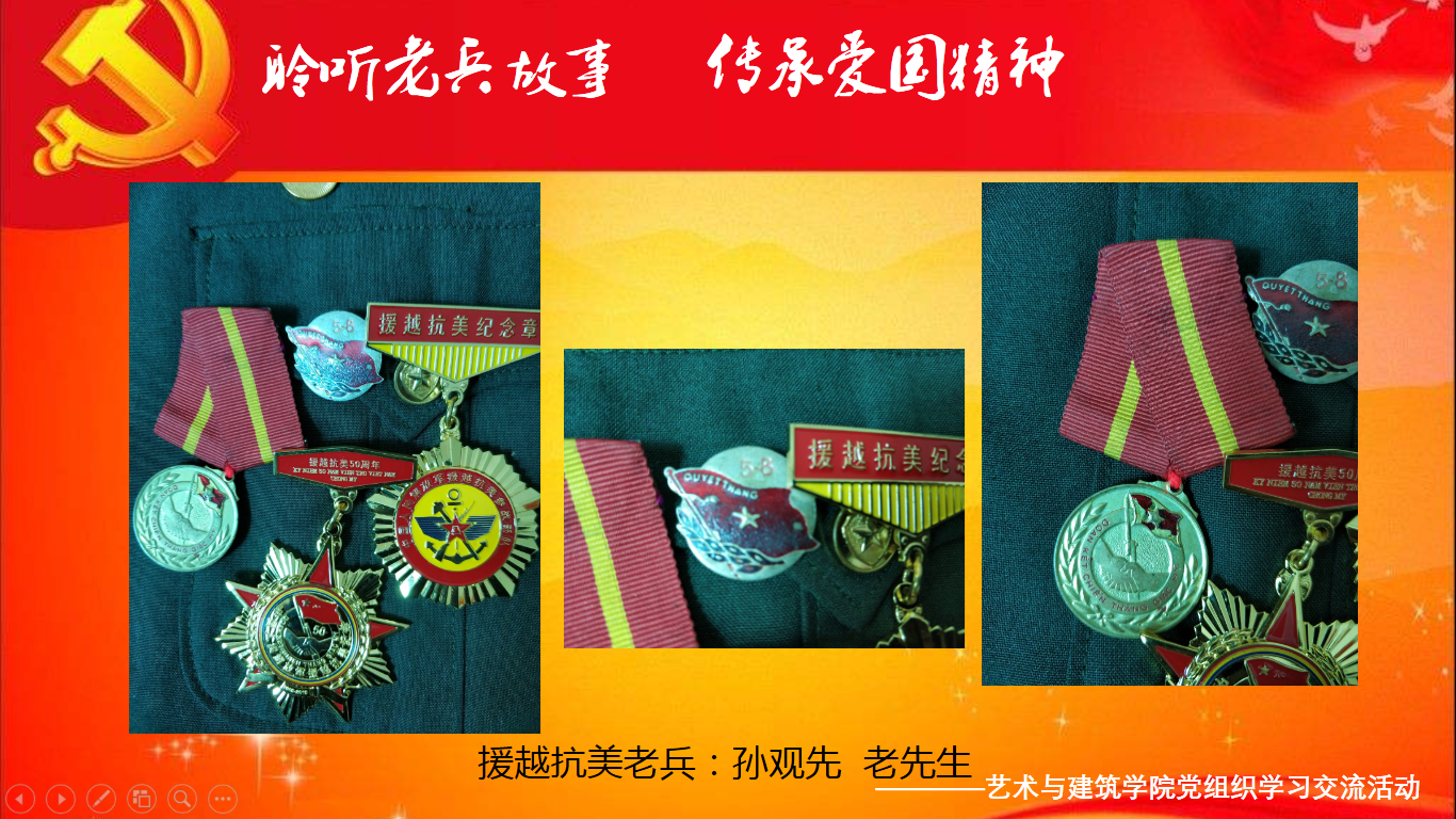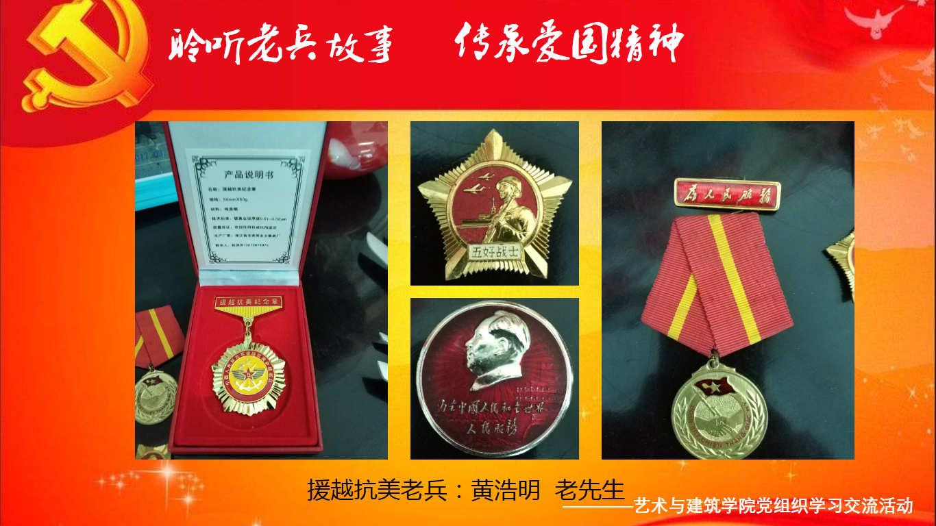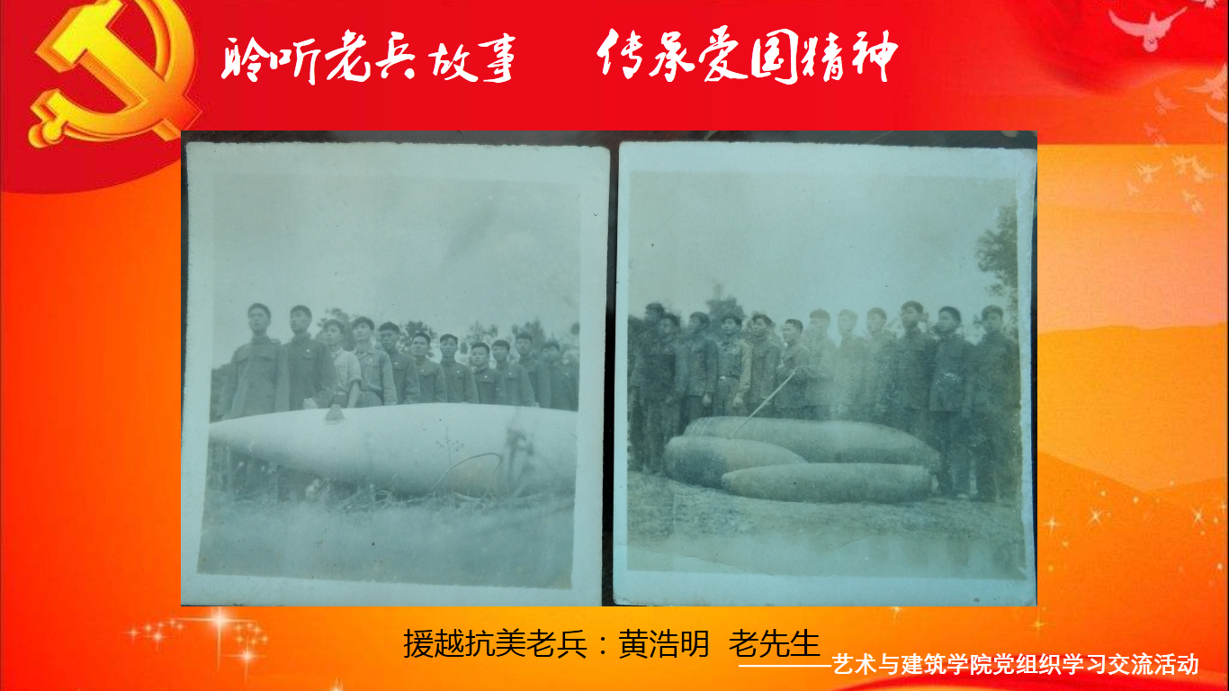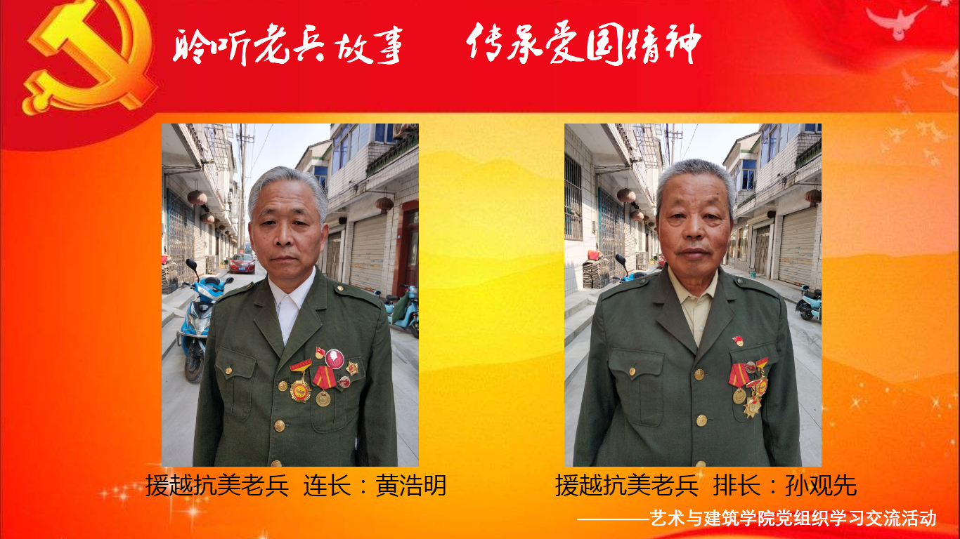 传承革命精神,发扬革命传统,根据学校党委安排,10月17日中午,艺术与建筑学院党总支在会议室开展“聆听老兵故事、传承爱国精神” 学习交流活动。此次活动特别邀请了曾经参加援越抗美战争的黄浩明和孙观先两位老战士讲述其军旅生涯中的励志故事。