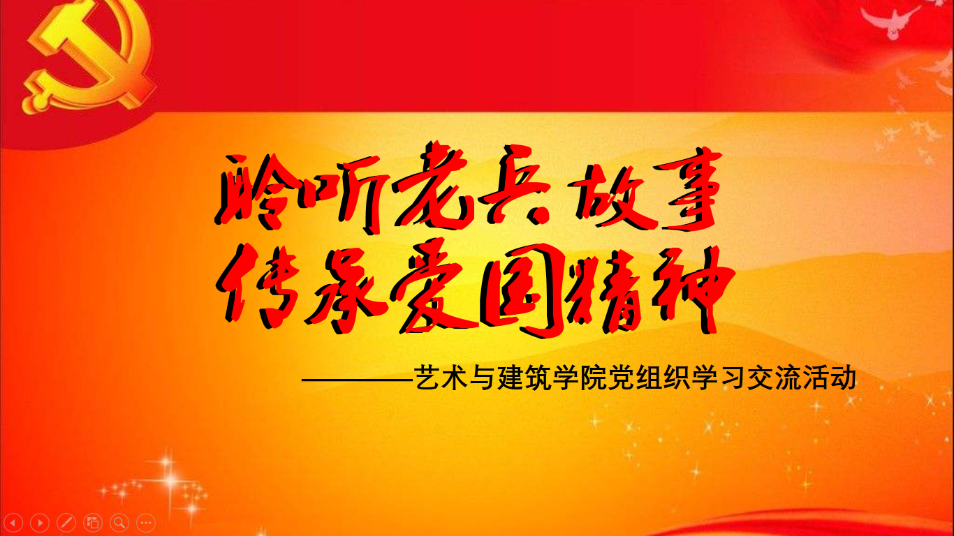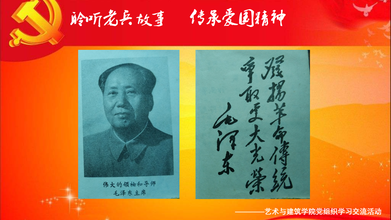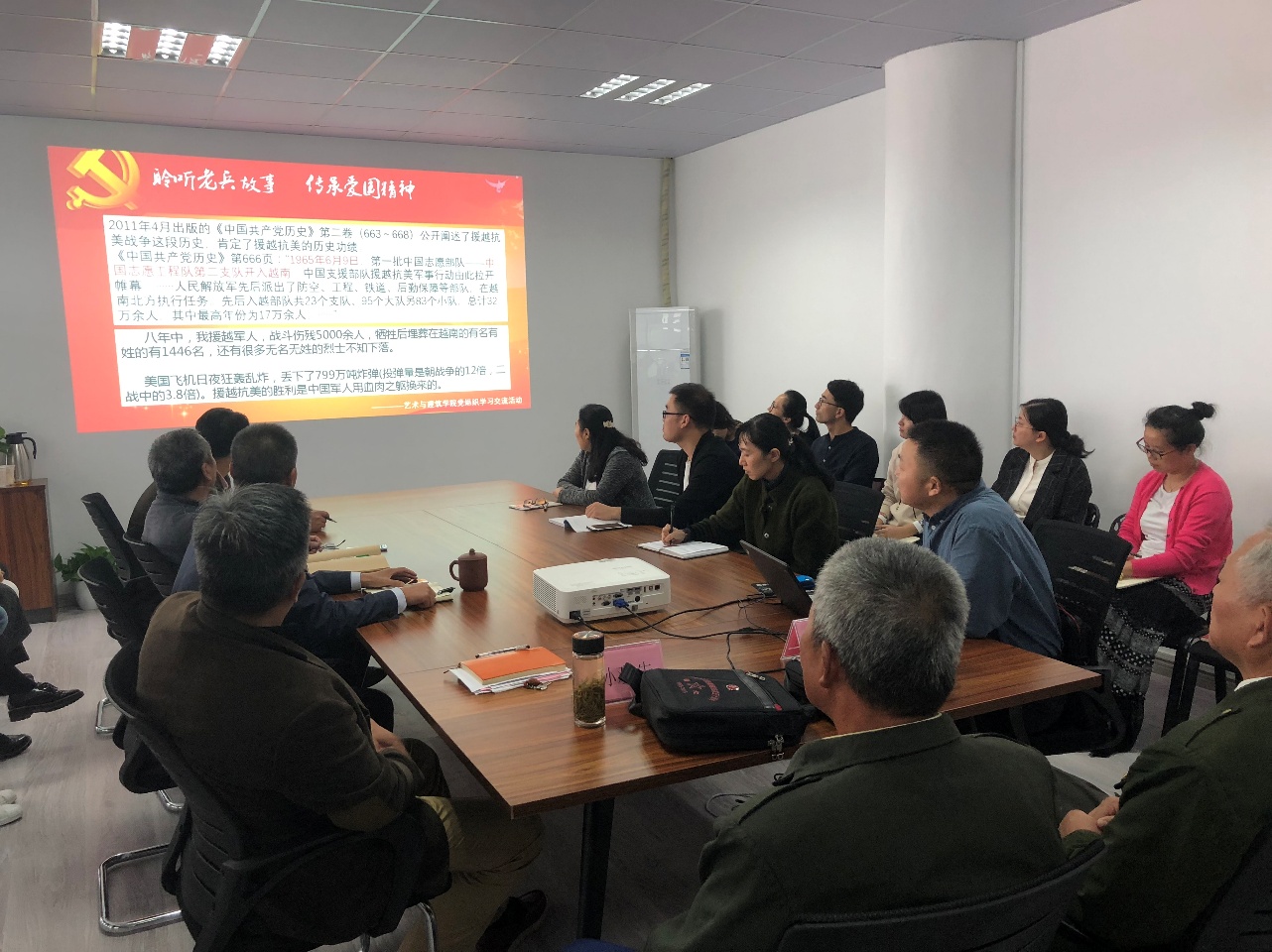 传承革命精神,发扬革命传统,根据学校党委安排,10月17日中午,艺术与建筑学院党总支在会议室开展“聆听老兵故事、传承爱国精神” 学习交流活动。此次活动特别邀请了曾经参加援越抗美战争的黄浩明和孙观先两位老战士讲述其军旅生涯中的励志故事。