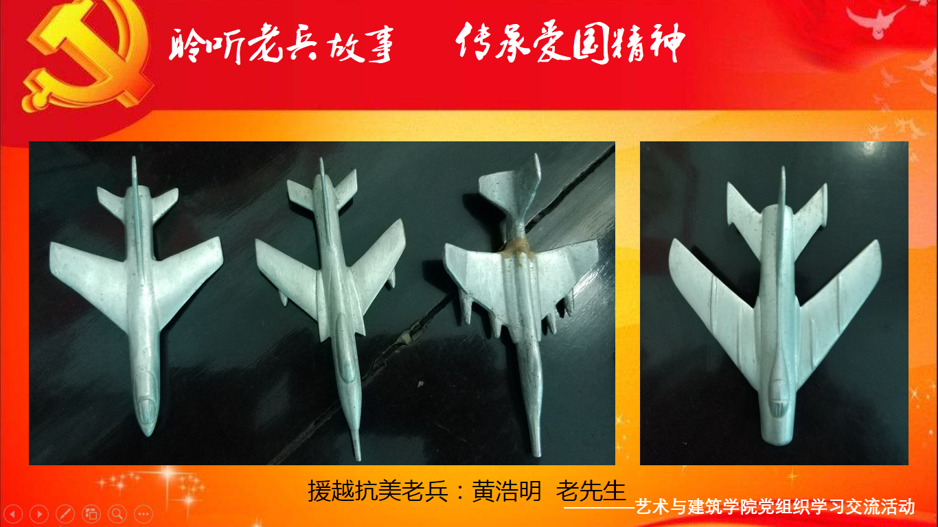 黄浩明和孙观先,1965年9月参军,12月奔赴越南参加援越抗美战斗。两位老战士向大家讲述了当年战争中射击轰炸机、拆除炸弹、抢修公路等事迹。 “当年飞机飞得很低,我们在地面利用机枪直接射击,但过了一下炸弹就在我们旁边落下爆炸了,有的战友肠子都出来了,爆炸的冲击波掀起的尘土直接侵入到了战友的皮肤里,现在的年轻一辈可能想象不到,但当时的战争是很残酷的。”孙老沉痛地回忆着。孙观先老先生现场挽起裤腿,膝盖处的伤疤至今清晰可见。老兵们还向大家展示当年入党申请书复印件、胜利奖章、纪念章、各种荣誉证书、部分胜利纪念品等物件,其中包括用美国轰炸机副油箱材料制成的美国轰炸机模型、苏联米格飞机模型。