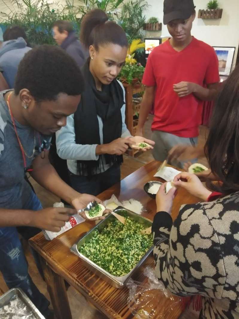 卢处帮助留学生捏饺子边