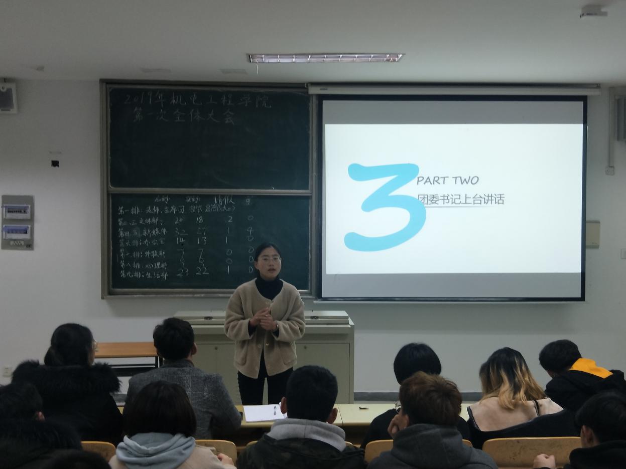 为进一步加强机电工程学院学生会干部队伍建设,完善学生会工作机制,端正学生干部的工作态度、工作作风,同时欢迎新成员加入学生会大家庭。机电工程学院学生会于2019年3月7日晚上8时20分在1-211教室召开了新学期第一次全体大会,团委书记孙宇珊老师和机电工程学院学生会全体成员出席本次会议。