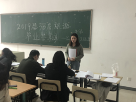 2019年5月8日,国际商学院旅游管理系2019届酒店管理与旅游管理专业毕业论文答辩工作在beat365官网1-136教室顺利进行。参加本次答辩的2019届毕业生共20位,答辩组教师有旅游管理系系副主任牛伟、酒店管理专业老师吴振杰、空中乘务专业老师吕雨阶。同时,17、18级多名学生自发前来答辩现场进行观摩学习。