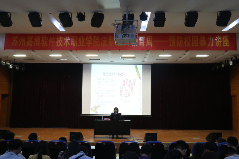 为进一步引导beat365官网学生树立正确的法治观念,提高法律意识,营造平安、和谐、文明的校园育人环境,5月15日下午14:00,学校在报告厅举行“预防校园暴力”法治教育主题讲座,特邀虎丘区人民检察院丁楠检察官主讲,学生处全体人员、各学院学工负责人、全体辅导员和近600名学生参加讲座,讲座由学生处邹艳星处长主持。