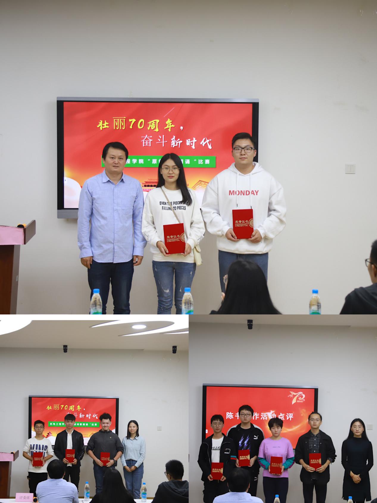 为庆祝新中国成立70周年,弘扬伟大的爱国主义精神,提高大学生的人文素质和道德情操,10月16日晚6:30,机电工程学院团委在青春健康俱乐部举行了“壮丽七十年·奋斗新时代”原创诗歌朗诵比赛。通过此次复赛,我院将选拔出两位获胜选手代表机电学院参加学校的朗诵比赛总决赛。