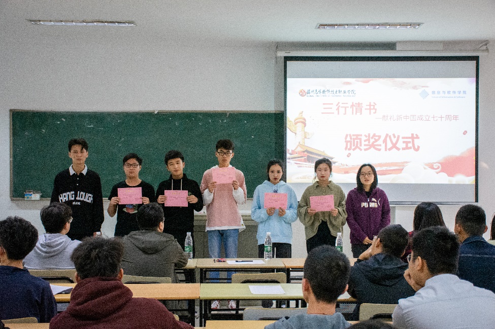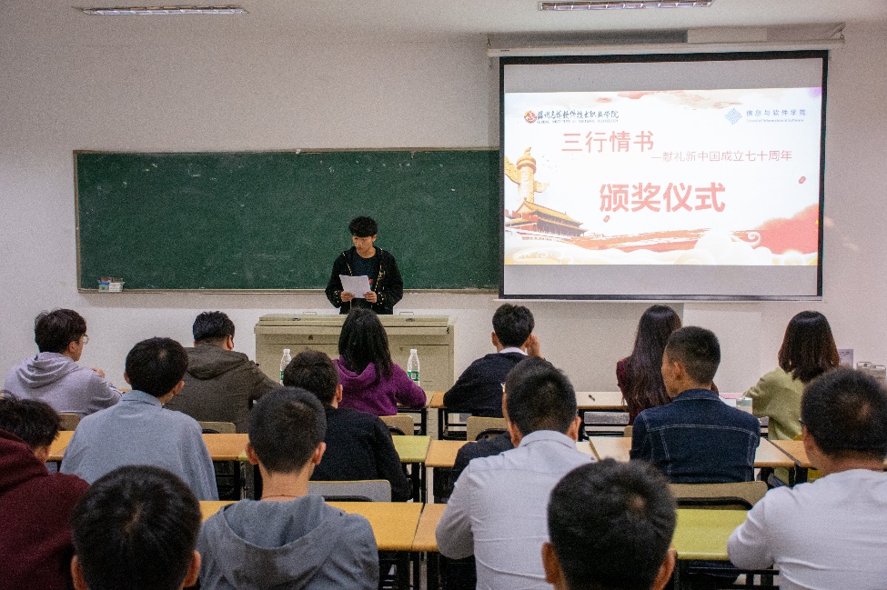 本次比赛共评选出一等奖1名,二等奖2名,三等奖3名,优胜奖8名,为表彰先进,信息与软件学院于10月21日下午举行了“三行情书”活动颁奖仪式,学院党总支副书记郑兰松老师,分团委书记顾笑老师,辅导员江鑫老师担任颁奖嘉宾,信息与软件学生会及青年学习社所有成员参加了颁奖仪式。