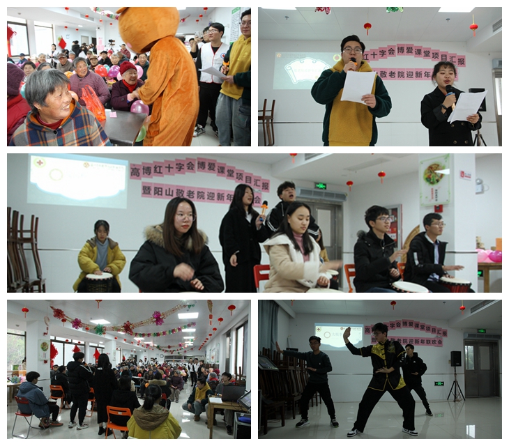随后是进行联欢表演,志愿者精心准备了《兔子舞》,身着卡通玩偶服装来到爷爷奶奶中间互动,逗得老人们开心不已、太极表演和合唱《我的中国心》博得了老人们阵阵掌声,非洲鼓伴奏的《安和桥》让老人们耳目一新,纷纷喊着再来一首,诗朗诵表达了全体志愿者对敬老院爷爷奶奶的爱意以及希望积极用自己的实际行动来陪伴老人的决心;阳山敬老院长者们也是多才多艺,84岁的张惠仙奶奶表演舞蹈《太湖美》和《红色娘子军》,舞姿优美,表演时随着音乐时而柔美,时而英姿飒爽;金玉堂和顾增诗两位爷爷是阳山敬老院公认的“歌王”,两人演唱的《革命人越来越年轻》和《我和我的祖国》,曲调优美,包含情谊,博得大家阵阵掌声。