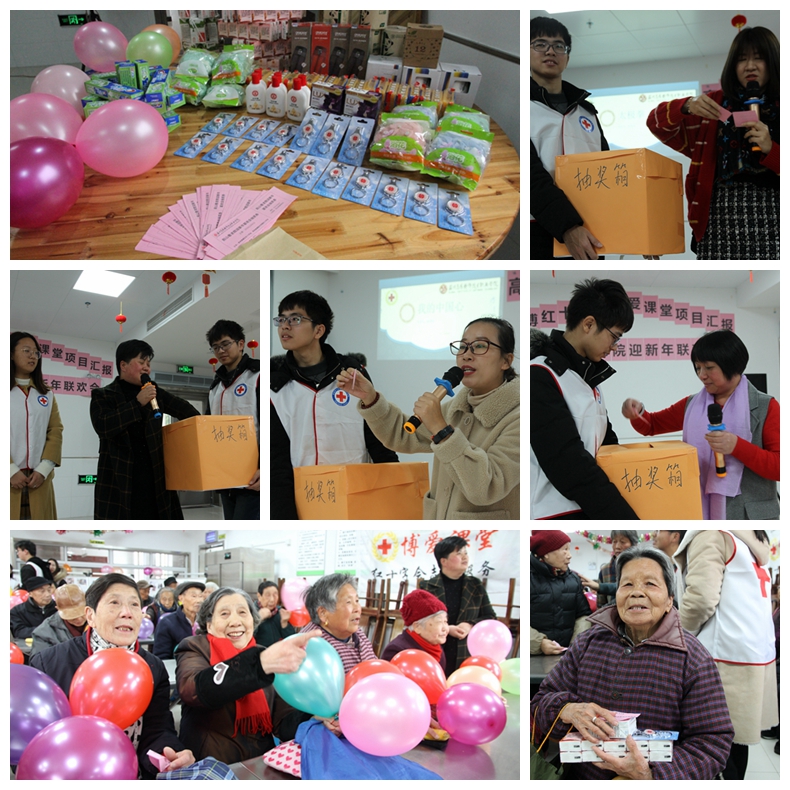 最后一个环节是抽奖,为了让敬老院的爷爷奶奶感受到志愿者的爱意,特别设计的抽奖环节,每个爷爷奶奶都有一张抽奖券,重温在他们工作时期参加单位年终团拜会时的景象。由高新区红十字戴晓雯、阳山敬老院王院长和杨科长以及高博学院王琴副处长进行抽奖,共计为到场的60多位老人发放了奖品。