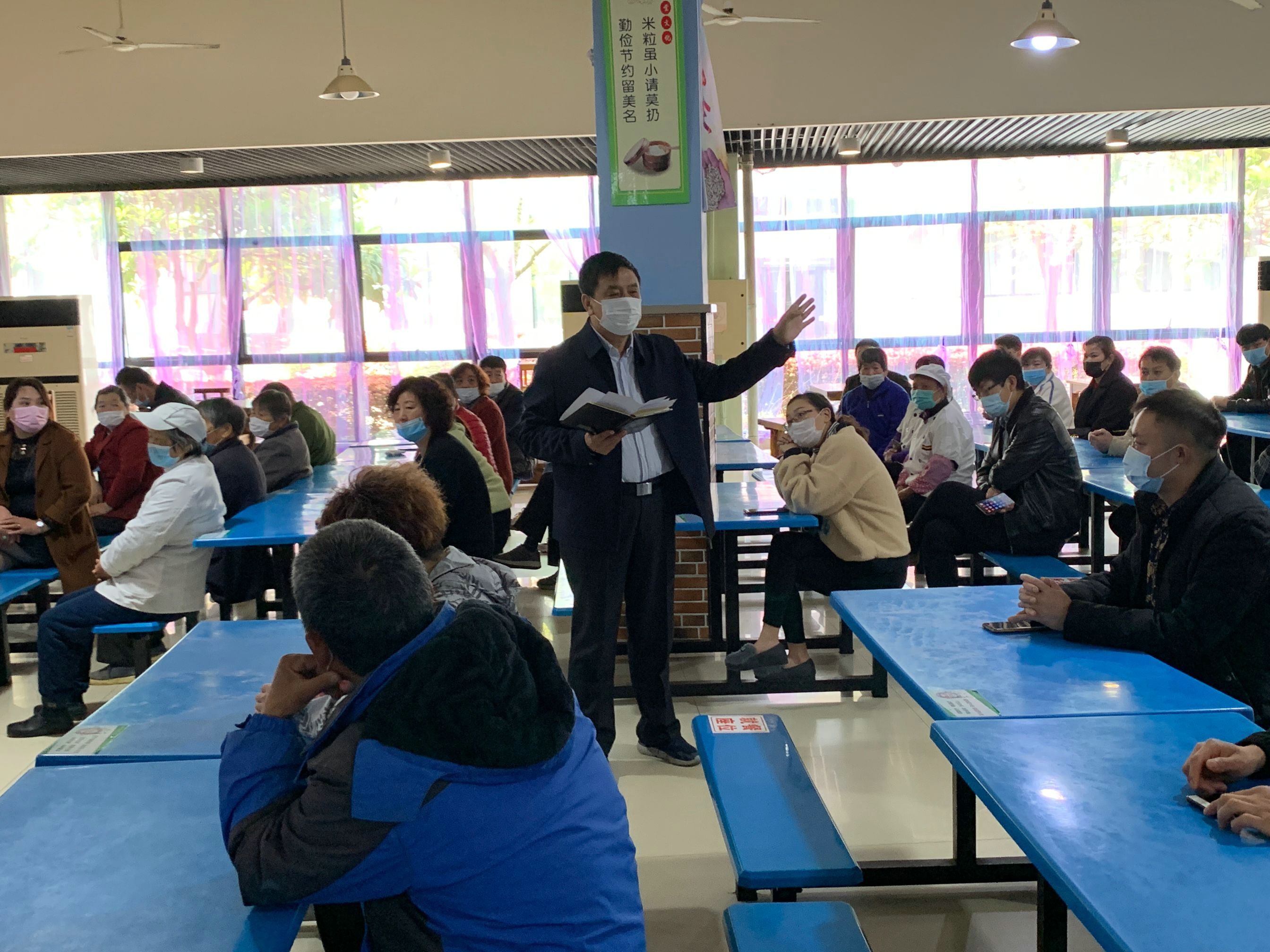 后勤处餐宿中心主任张宏虎传达了江苏省市场监督局、教育厅《关于进一步加强春季校园食品安全监管工作的通知》(苏市监〔2020〕78号)。并就做好食堂疫情防控和食品安全工作作了具体培训辅导。张主任从人员管理、消毒防疫管理、设施设备管控、食材管理、加工操作管理、就餐管理等六个方面进行详细讲解,重点突出,通俗易懂,便于掌握。