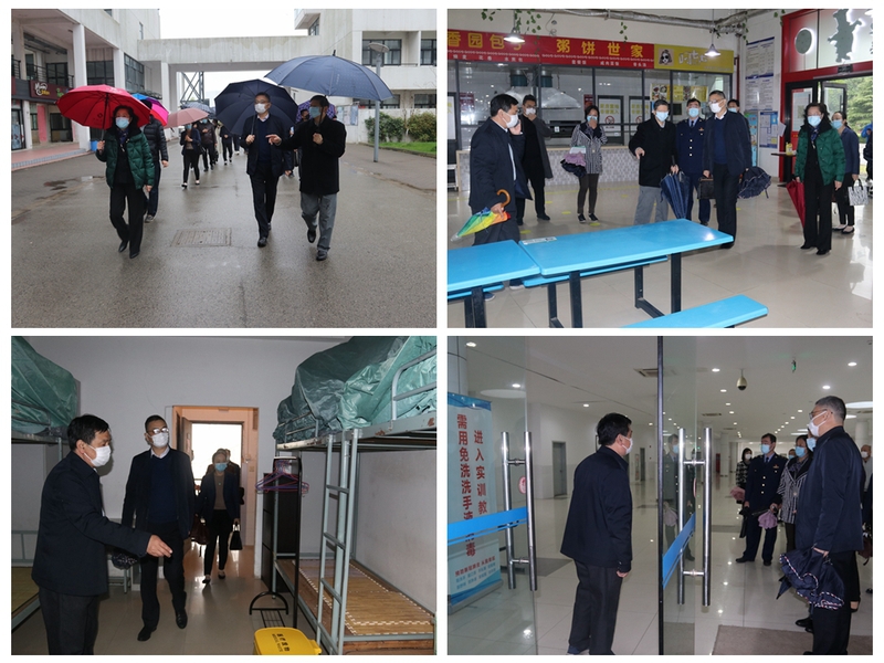 督查组一行先后对学生宿舍、医务室、隔离场所、教室、实训室、食堂、储备物资等进行了现场查看,了解了开学后学生衣食住行环境以及防疫物资准备等方面的情况。