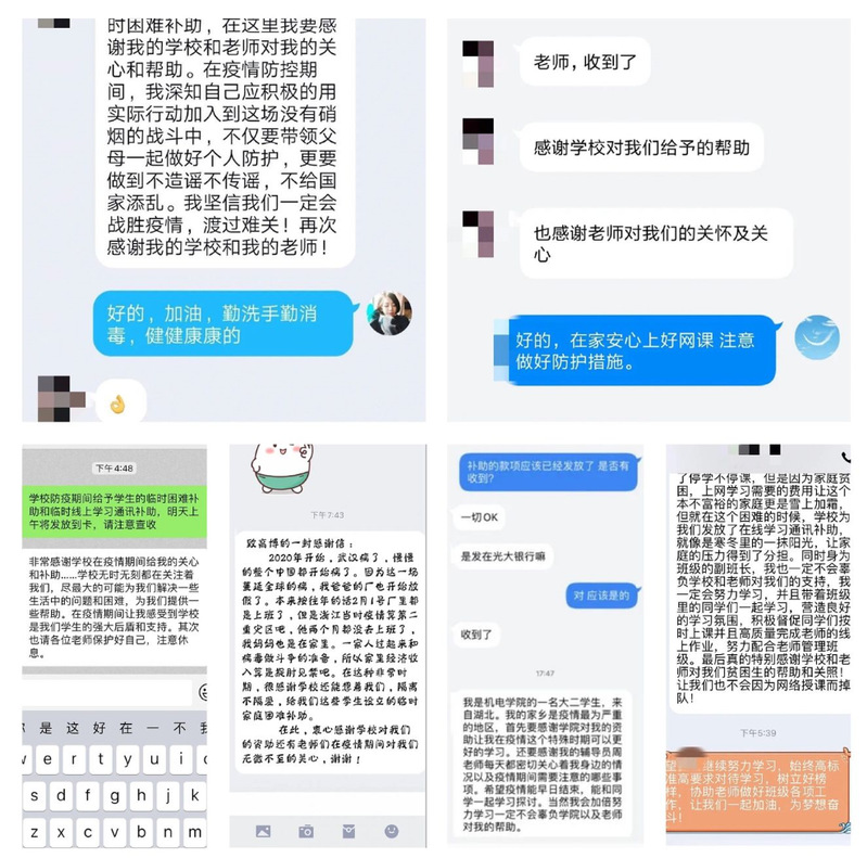 在疫情防控期间,通过各二级学院一一摸排,掌握学生的真实情况,帮助解决大家的实际问题,我院共对受疫情影响的140余名困难学生发放临时困难补助及线上学习通讯补助3.4万余元,很多学生通过微信、QQ、视频等形式对我院的这些资助举措表示了感谢。