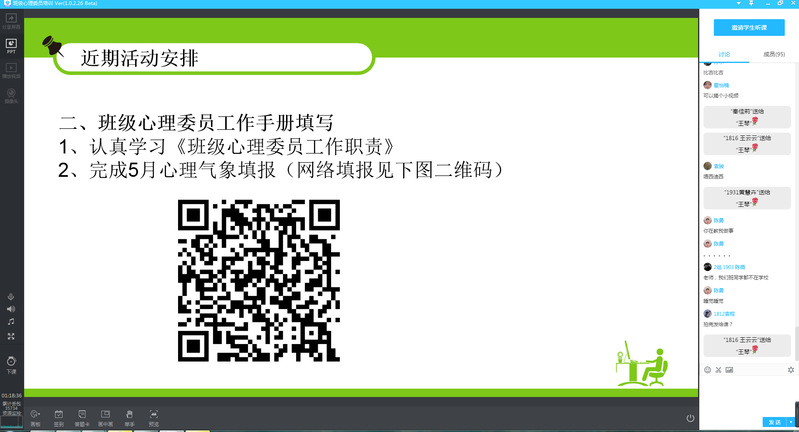 班级心理委员是学校心理健康三级网络重要组成成员,为进一步帮助广大学生增加心理弹性,更好的面对复学后对疫情的担心害怕以及对封闭管理不能外出的不满情绪等,学生健康教育中心特别组织了一次班级心理委员培训,帮助班级心理委员掌握基本的方法和技术在班级中关心、帮助有需要的同学,并及时识别和上报有异常心理问题的学生。本次培训采用腾讯直播的形式,通过理论宣讲、知识问答、工作职责考核等环节,帮助班级心理委员进一步增强胜任力。