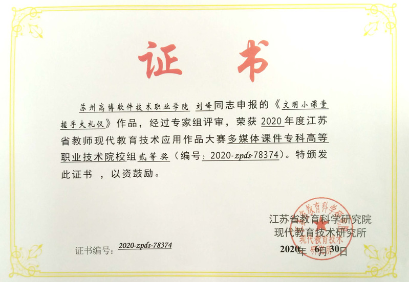 新学期伊始,传来喜报。在2020年度江苏省教师现代教育技术应用作品大赛中刘峰老师制作的多课件《文明小课堂握手大礼议》获得多媒体课件二等奖,论文《“微学习”环境的治理:基于教育治理体系与治理能力的视角》获得教育技术应用论文二等奖。