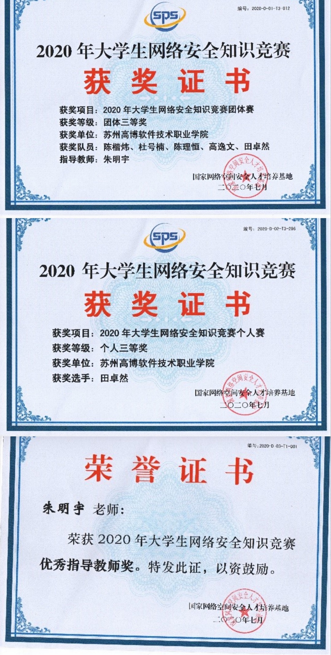 在中国信息安全测评中心的大力指导下,由国家网络空间人才培养基地主办的2020年大学生网络安全知识竞赛,历时两个多月,来自全国各地近600所中、高等院校的5万8千多名本专科学生,经过两个多月的同台竞技,于7月28日落下帷幕。本次比赛,对于信息与软件学院的学生而言,是一次难忘的竞赛,也是一次良好的开端。在本次的比赛中,信息与软件学院精心组织学生参加,同时对参加的学生进行网络安全知识深度和广度的培训。经过激烈的竞赛,我院wonder5战队(陈楷炜,杜号楠,陈理恒,高逸文,田卓然)获得团体三等奖,同时田卓然同学的超常发挥,获得个人三等奖(本次竞赛的获奖率只有6%);另外,我院朱明宇老师也获得优秀指导教师奖。
