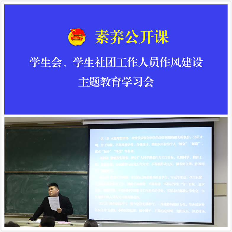 为从严落实共青团和学联组织对高校学生会的指导管理,深入推进beat365官网学生会组织改革,全面加强beat365官网学生会、学生社团工作人员的作风建设,青马学院全体学员对《关于学生会、学生社团工作人员改进作风服务同学的若干规定》进行了学习解读。胡书记强调无论是作为作为学生会还是学生社团工作人员,我们都要更好地代表和服务广大同学,不断加强理论学习,坚持依法依章程开展工作,恪守学生本分、牢记服务宗旨、永葆理想情怀、勤勉务实做事、营造平等氛围、摒弃庸俗习气,要以更高的标准要求自己,守纪律、讲原则、做表率,塑造清新阳光的组织形象。