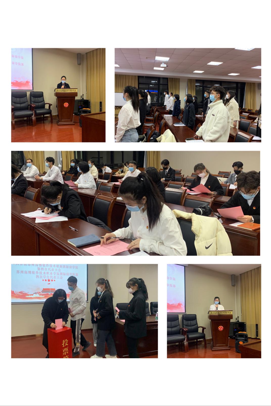 共青团苏州高博软件技术职业学院国际商学院第四次代表大会、苏州高博软件技术职业学院国际商学院第四次学生代表大会于2020年12月17日晚上5:30在3-215学术报告厅举行。本次大会由国际商学院学分团委书记王瑞主持,出席大会的有:学校团委副书记兼教工直属支部书记、校学生会秘书长王鑫老师,国际商学院党总支副书记张红老师、国际商学院学辅导员张伟老师,国际商学院学辅导员蒋运奇老师、校学生会执行主席束馨怡同学以及各团支部推举的代表候选人。