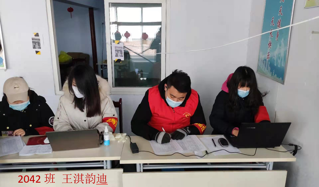 “现在正是国家面临困难的时候,我们新时代大学生更应该行动起来,加入到疫情防控队伍中去,用实际行动诠释当代年轻人的担当,积极投身于这场没有硝烟的战‘疫’当中,与家乡人民一起抗‘疫’!中国加油!”这是2040班刘亚非的心声。在内蒙古乌兰察布市疫情防控工作开展后,他第一时间向当地居委会提出了做志愿者的申请。每天他都会在村口排查登记出入车辆的信息,劝导村民不外出、不扎堆、勤洗手、勤消毒,用认真热情的状态身体力行地践行自己的心声。
