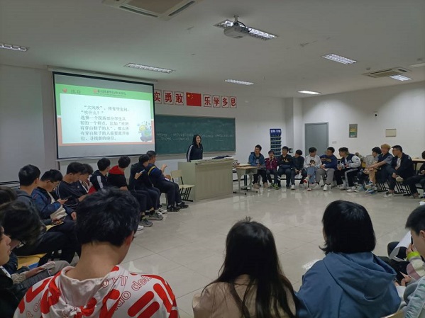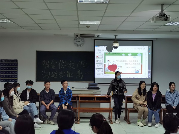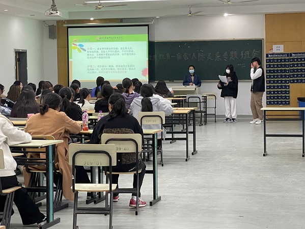 针对学生校园生活中存在较多困惑的宿舍人际关系与大学生恋爱价值观。本次心理健康教育主题班会分为“宿舍你我他 沟通零距离”,“美丽不困惑,智慧不迷茫—大学生恋爱面面观”两个专题。由学生处健康中心统一进行专题培训和备课,学生健康教育中心陈祎雯老师立足于从沟通开始,聚焦大学生人际关系进行探讨,分别从单项与双向的方向,让群体成员体验从沟通开始的宿舍相处之道。沈方瑛老师通过场景探讨、小组讨论,使学生了解异性交往应该注意的准则,学会与异性健康交往。王琴老师现场总结心理健康教育主题班会的重点、难点以及注意事项,布置落实工作。