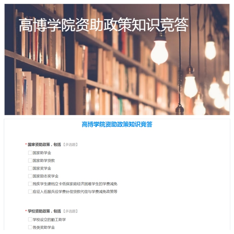 本次线上问答活动命题范围为《高博学院资助政策》,问答题目涉及内容广,不仅涵盖国家助学贷款、奖助学金、勤工助学、退役士兵教育资助、征信还款等多个方面,而且形式多样丰富,设有单项选择题、多项选择题、填空题。既考查同学们的综合素质,又向同学们广泛普及国家资助政策。
