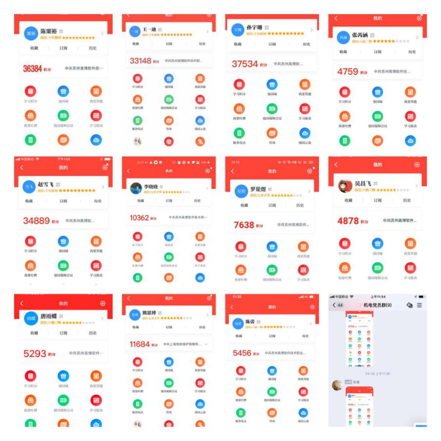随后,大家积极晒强国积分并分享自己的学习体会。赵雪飞老师分享说:“我是一名共产党员,我感到无比骄傲和自豪,今年的开展的党史学习教育,更是把我们带回了那个热血沸腾的火红年代。“学习强国”平台已经成为了我们的掌中宝,里面的学习内容丰富多彩,让我们受益匪浅。”