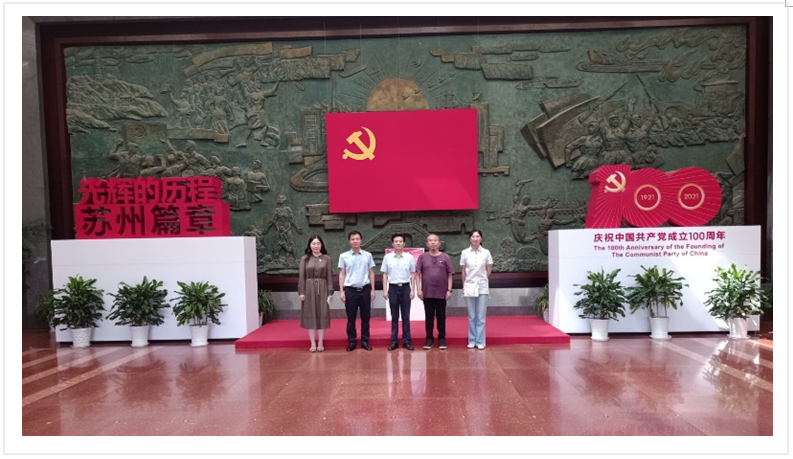 参观学习结束后,全体党总支委员在“光辉的历程·苏州篇章”主题墙和“庆祝中国共产党成立100周年”LOGO墙前合影留念。此次参观学习让我们进一步了解中国共产党党史和苏州革命光辉历程,更好的锤炼我们每个共产党人不忘初心、牢记使命、永远奋斗的党性修养,“强国有我、请党放心”。艺术与建筑学院党总支成员将带领全体教师党员始终贯穿党史学习教育,不断总结历史经验、传承红色基因、坚持正确方向,为推动党建工作和提升教学质量作出贡献。(艺术与建筑学院党总支 吴兵)