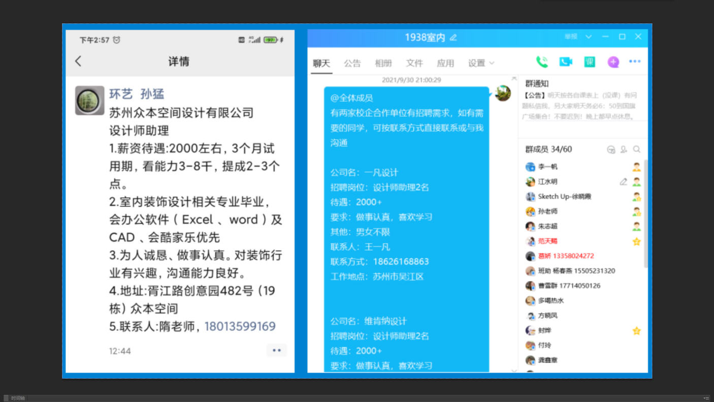我院环艺教师运用朋友圈、毕业班QQ群,多途径为毕业生提供企业招聘信息,线上招聘公司主要包括:一凡设计、维肯纳设计、苏州众本空间设计有限公司、苏州红蚂蚁装饰有限公司、苏州鸿沐装饰工程有限公司。