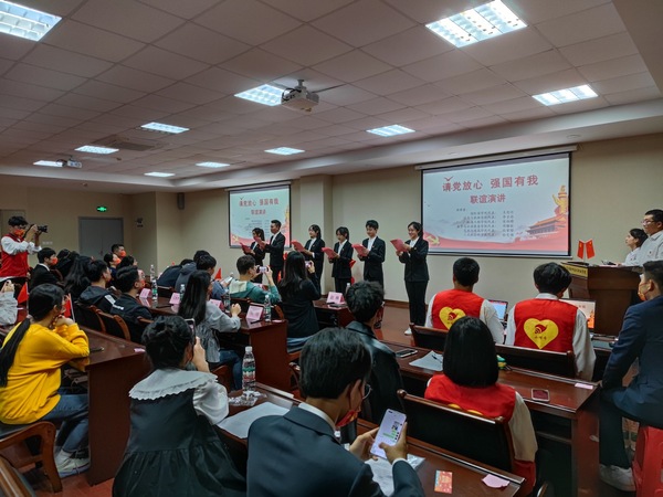10月28日晚上6点,由国际商学院分团委承办的“请党放心 强国有我”主题演讲比赛在行政楼215会议室圆满结束。出席本次活动的有校团委书记王鑫老师,校团委副书记程前老师以及各二级学院分团委书记。本次活动严格按着疫情防控的标准,提前进行现场消毒,全程配戴口罩,隔位就座。