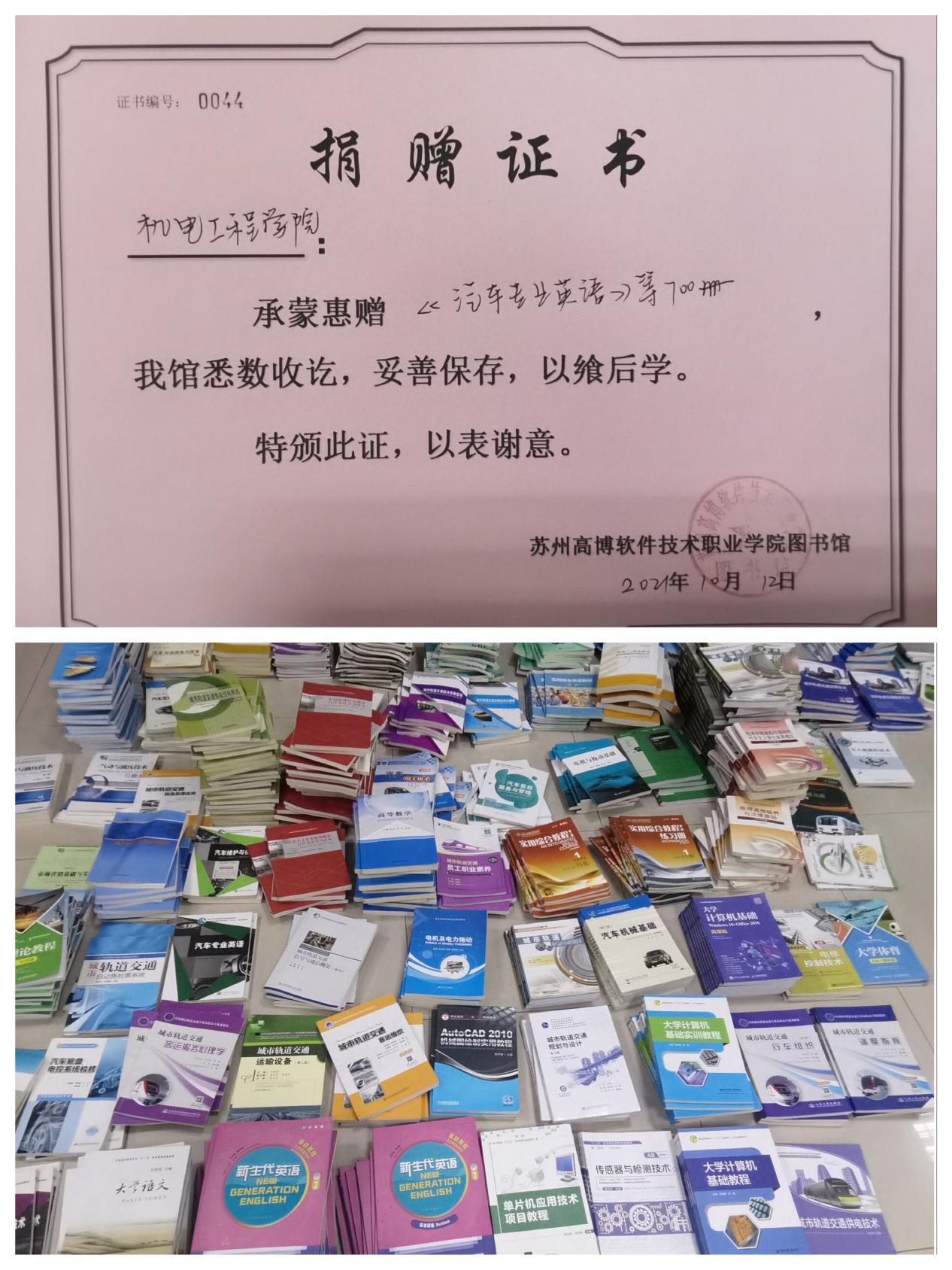 活动开展前,机电学院团委部署落实各班班委做好本班捐赠图书的动员及收集工作,并记录好捐赠的数量。本次的图书捐赠活动,通过老师们的精心筹备和学生们积极参与,共捐赠教育教辅类、文学杂志类、经典励志类等相关图书700余册。为表扬同学们的无私奉献精神,学校图书馆给机电工程学院颁发了《捐赠证书》,以表谢意。学生捐赠书籍使图书得到了再次利用,避免了资源的浪费,为学院师生提供了更多的图书资源。捐书的学生们纷纷表示,捐赠书籍是爱心传递地的一部分,捐书既是为学校提供图书材料,也是为学校的发展贡献自己的一份力量。
