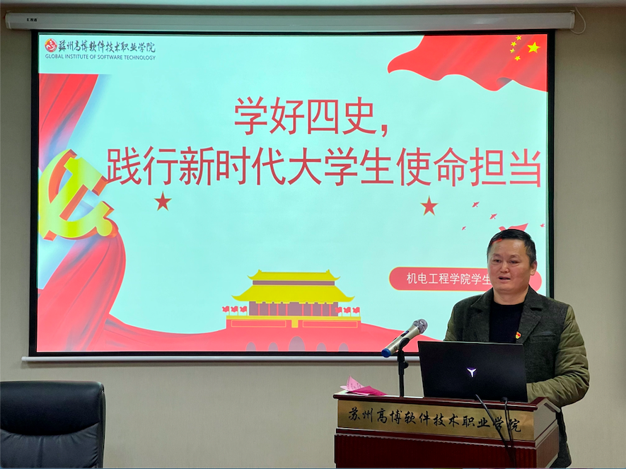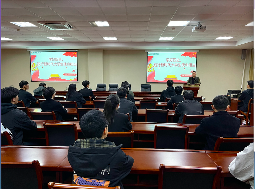 2021年11月24日晚6点半,机电工程学院学生党支部在行政楼215多媒体会议室开展党日活动。机电工程学院党总支副书记陈粟裕老师以“学好‘四史’,践行新时代大学生使命担当”为题讲党课,机电工程学院学生党支部组织学生党员和部分团学干部参加会议。