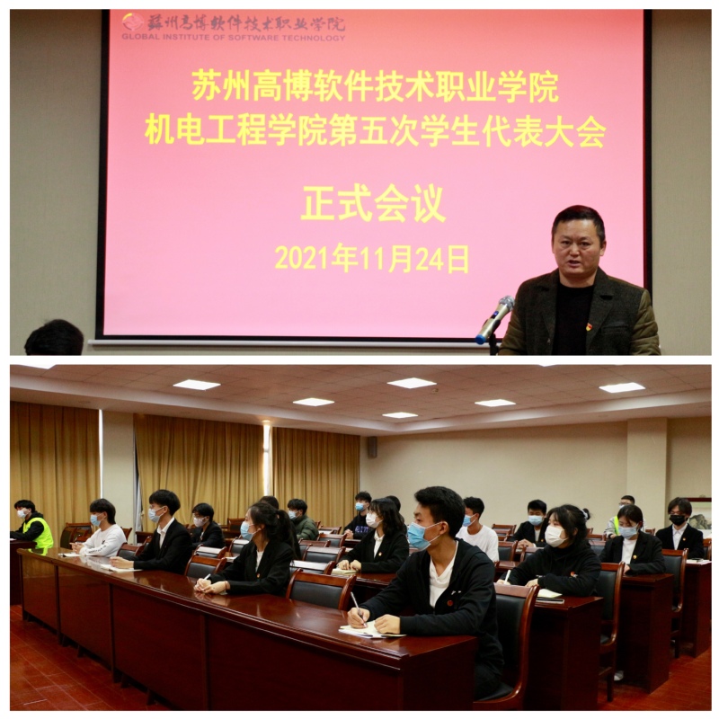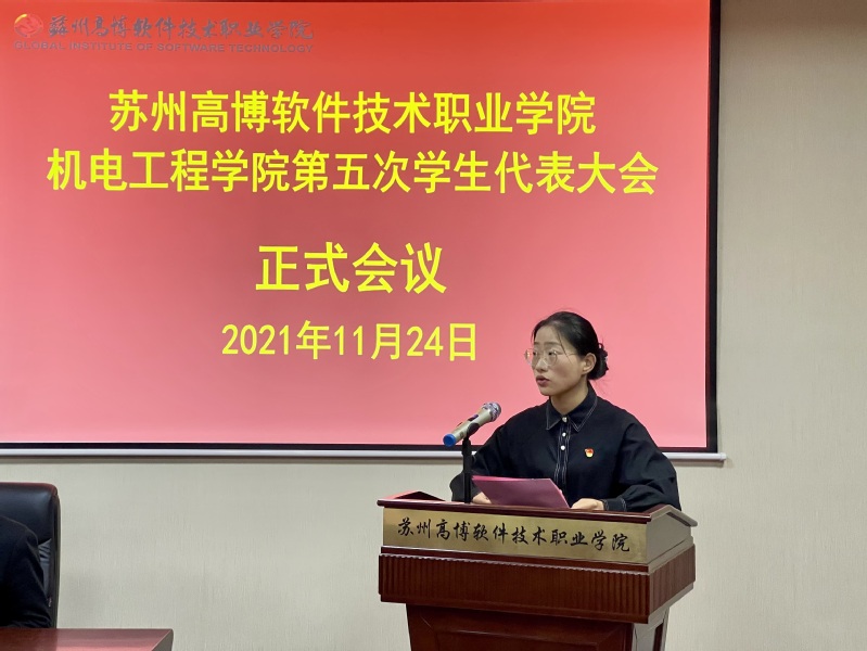 在校团委的关怀指导和机电工程学院党总支的正确领导下,经各级团组织和广大团员青年学生的长期共同努力,精心筹备之下,苏州高博软件技术职业学院机电工程学院第五次学生代表大会(简称:“苏州高博软件技术职业学院机电工程学院第五次学代会”)于2021年11月24日下午16:00在行政楼215学术报告厅顺利召开。