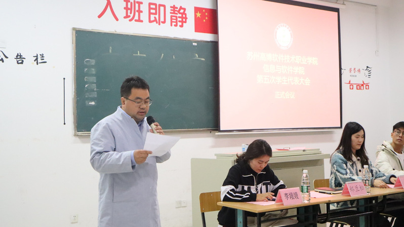 接着,会议审议通过《关于苏州高博软件技术职业学院信息与软件学院第四届学生会工作报告的决议(草案)》。会议秉承公平公正公开的原则,由全体学生代表投票选举产生信息与软件学院第五届学生会主席团、出席苏州高博软件技术职业学院第五次学生代表大会的代表。计票的同时,宣读了《倡议书》以及《关于学生会、学生社团工作人员改进作风服务同学的若干规定》。会议最后由信息与软件学院辅导员马云昊老师宣读信息与软件学院第五届学生会主席团、出席苏州高博软件技术职业学院第五次学生代表大会代表名单。