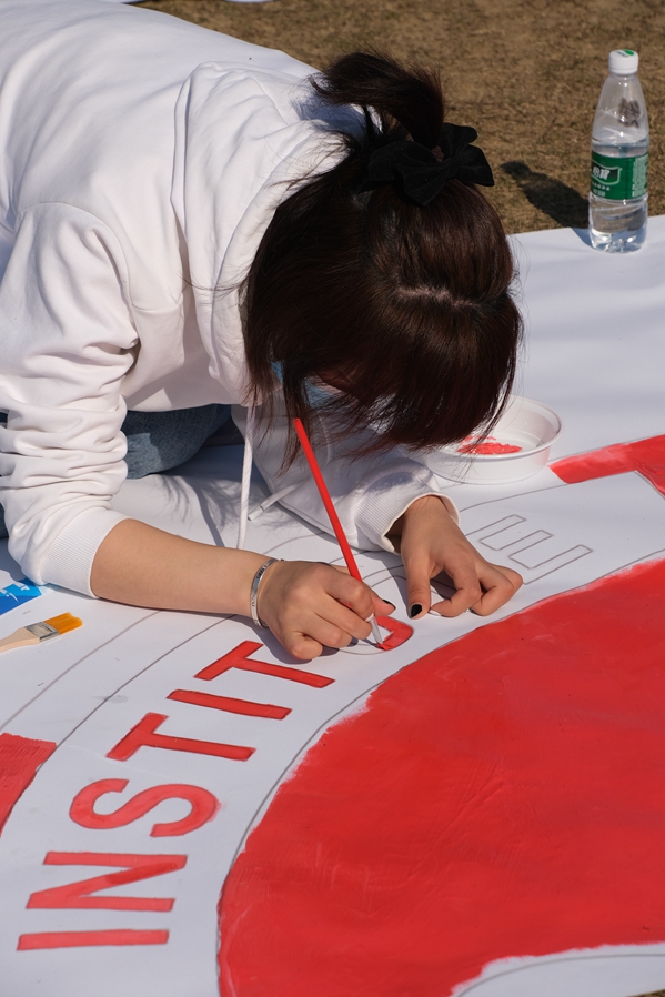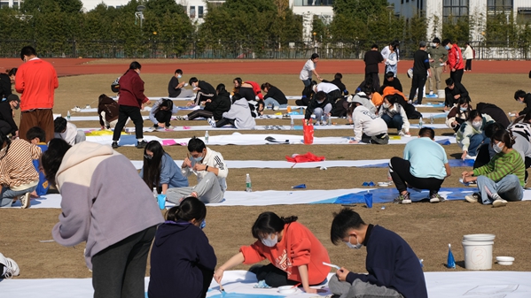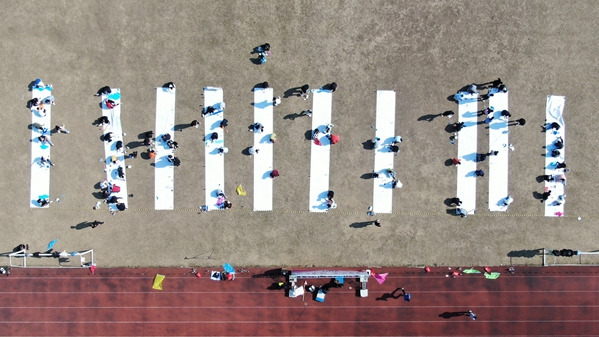 最后的一个团建项目是——纳斯卡巨画,要求是每组成员要完成各自画布的绘制,最终十组成员的画布拼接成为一幅 10*15米的巨画。大家分工明确,互帮互助,耗时一个小时才完成的巨画,充分体现了合作与竞争的关系。当巨画拼接完成后,“青春无畏 健康高博”的主题,也将整个团建活动的氛围推向了最高潮。