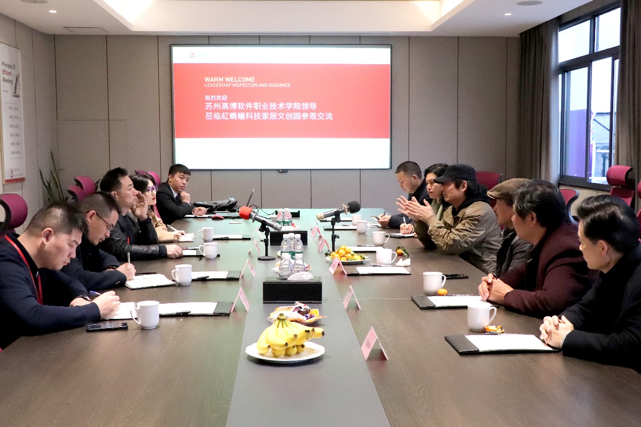 为进一步创新校企共育“工学结合”的人才培养模式,积极推进与行业名企的深入合作,12月7日,艺术与建筑学院与红蚂蚁集团企业(以下简称红蚂蚁公司)在红蚂蚁公司总部会议室召开校企合作恳谈会。红蚂蚁公司董事长李荣、人力资源部总监纪木仙、营销企划中心总监兼苏州大区总经理范伟、执行总裁钱士亮、董事长助理张敬波;苏州高博软件技术职业学院副校长陈家颐、校特聘教授廖军、教务处长陆霞,艺术与建筑学院院长王雨中、书记施建平、院长助理江水明等出席会议。