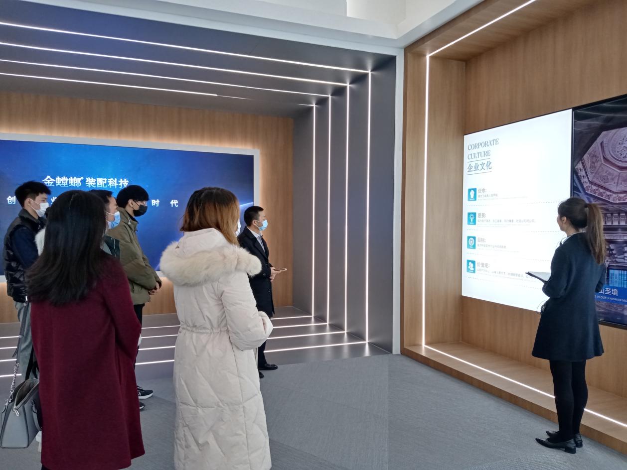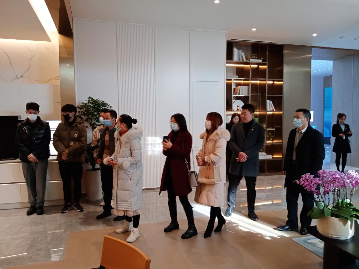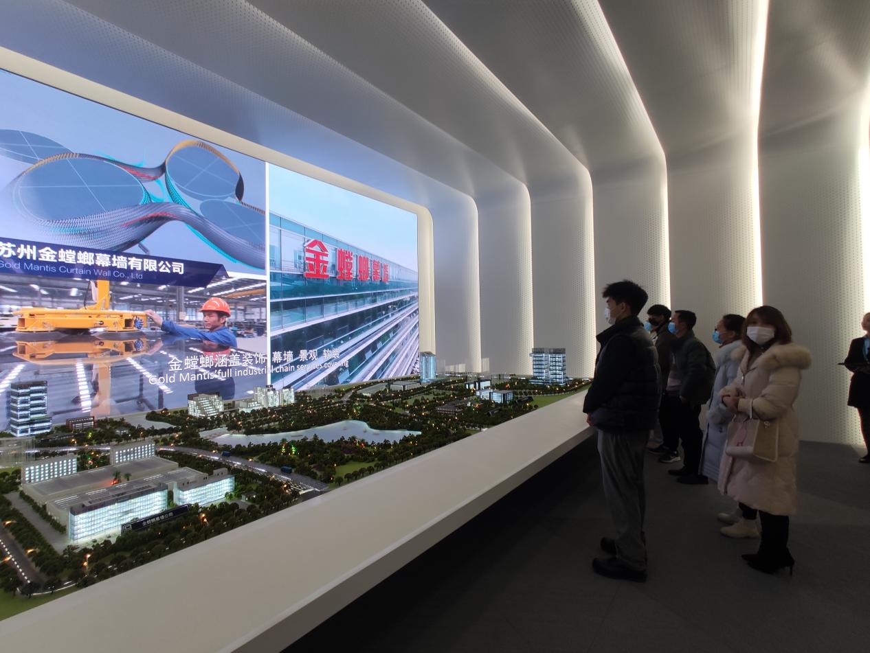 苏州金螳螂建筑装饰股份有限公司设计研究院人力资源部总监徐青云、设计研究院总工程师戴从庆,商务服务中心刘梦繁热情接待了学院一行。在戴院长的带领下,师生们共同参观了园区运营中心一楼展厅、品宅展厅、南3楼装配式展厅。