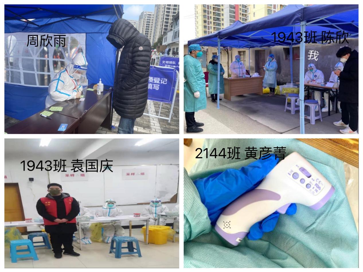 2046班市场营销专业焦鑫昊同学在河北省枣强县王均乡参加疫情防控志愿服务,负责值班测体温,登记健康码;2049班电子商务专业的刘思文同学在河北省沧州市河间市米各庄镇张兴屯村参加疫情防控志愿服务,负责采集往返人员信息;2050班酒店管理专业孟圆同学在吴中区木渎镇金山浜社区玉景花园b区参加疫情防控志愿服务,负责协助工作人员登记采样信息。
