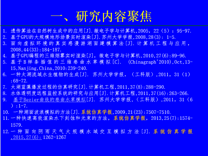 李云飞教授结合自己十余年针对太湖波浪仿真、模拟蓝藻爆发、湖面烟雾实时渲染等研究工作经验,提出科技论文写作的最佳途径之一是聚焦某一特定研究领域开展持续性的研究工作。在不断取得的研究成果之上,撰写的科技论文内容会越发充实和饱满,创新点也会随之增加。