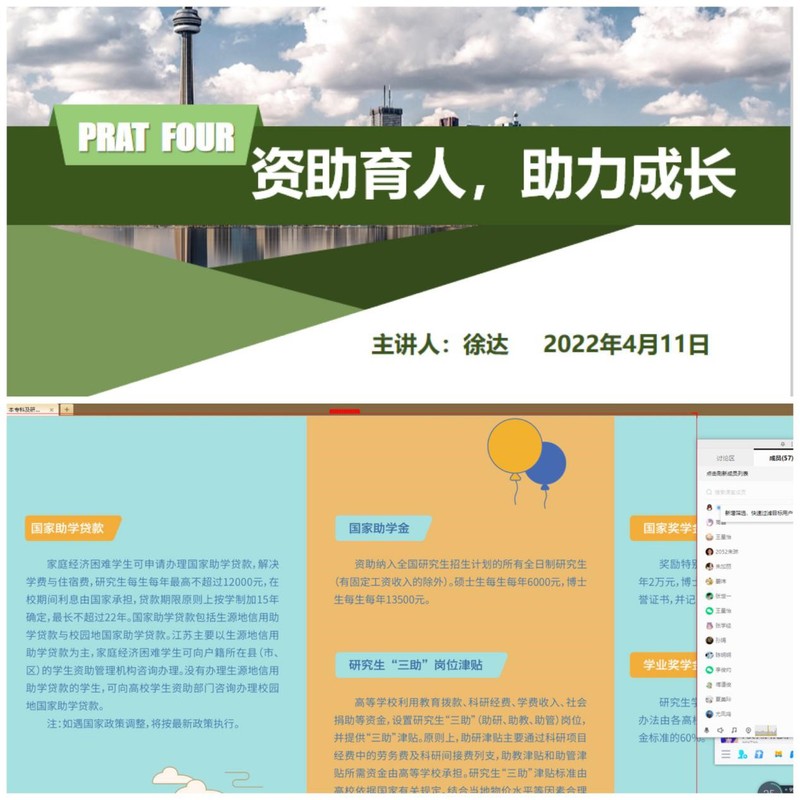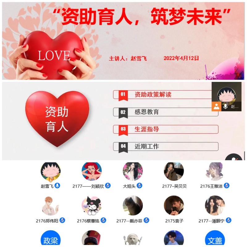 为进一步加大资助政策宣传力度,普及家庭经济困难学生资助知识,了解疫情期间需要帮扶的学生状况,切实呵护人文社科学院家庭经济困难学生健康成长,学院于4月11日、4月12日面向全体学生开展了“资助育人,筑梦未来”线上主题班会。