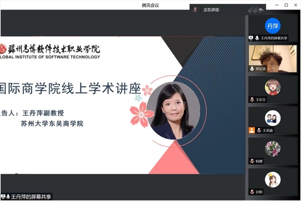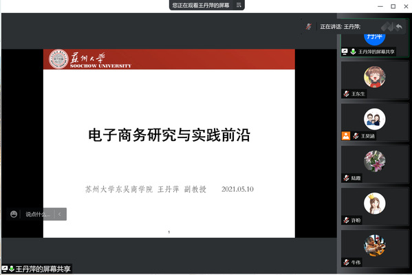 2022年5月10日国际商学院举办了本学期第一场学术讲座,本次报告由beat365官网特聘教授、会计金融系系主任罗正英主持,邀请到了苏州大学东吴商学院电子商务系副教授王丹萍,她博士毕业于上海财经大学,曾在中欧国际工商学院任院长研究助理,在电子商务专业领域有着丰富的理论与实践经验。本次报告采用线上形式,国际商学院、人文与社会科学学院全体教师参加了本次学术讲座。