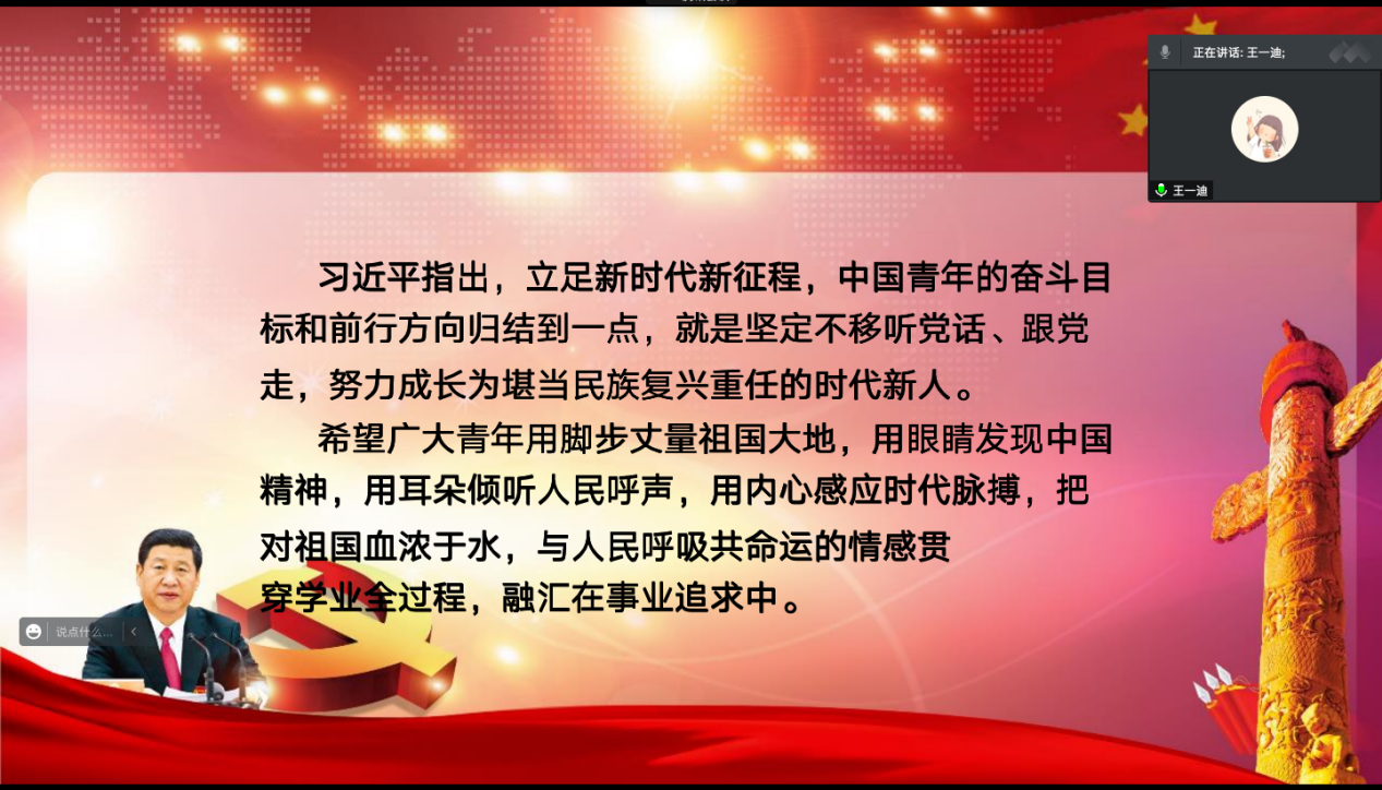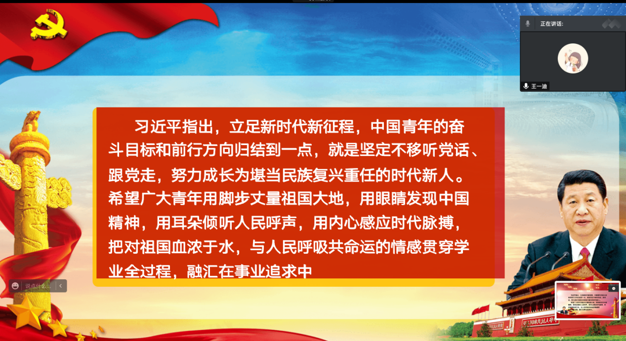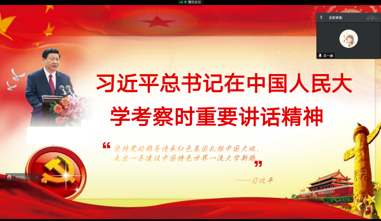 在五四青年节到来之际,中共中央总书记、国家主席、中央军委主席习近平2022年4月25日上午来到中国人民大学考察调研并发表了重要讲话。机电工程学院学生党支部书记王一迪老师组织支部学生党员于2022年5月13日19:00进行了线上学习。