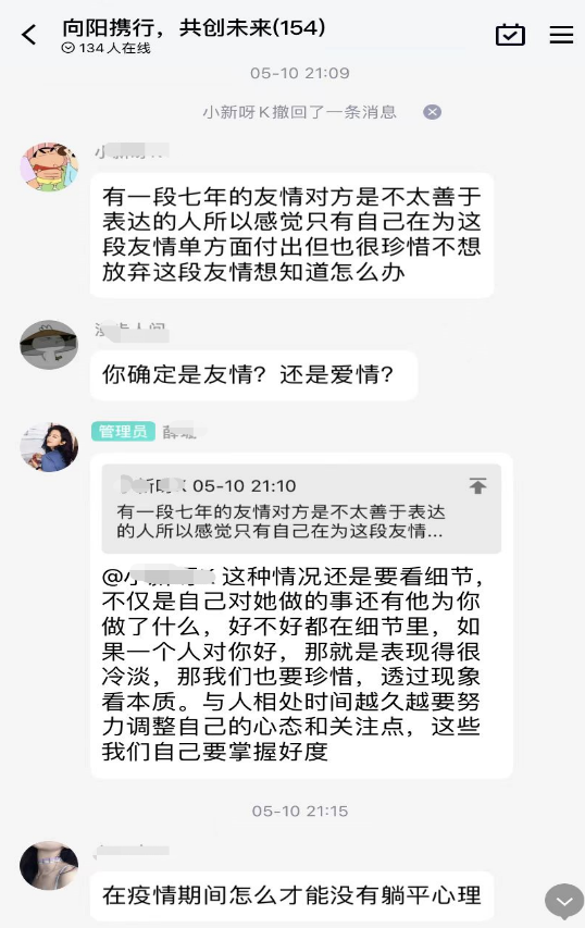 在“解忧记事·高博处方”活动中,通过收集表小程序,同学们诉说疫情期间的感受、日常生活中的趣事或学习上的烦恼,互相给予安慰与建议,构筑人与人之间爱的桥梁。2012班杜婷婷同学在QQ群内提出了自己的烦恼并且得到了满意的回答,她认为这次心理活动可以互动交流、互相鼓励,可以给别人带来温暖。