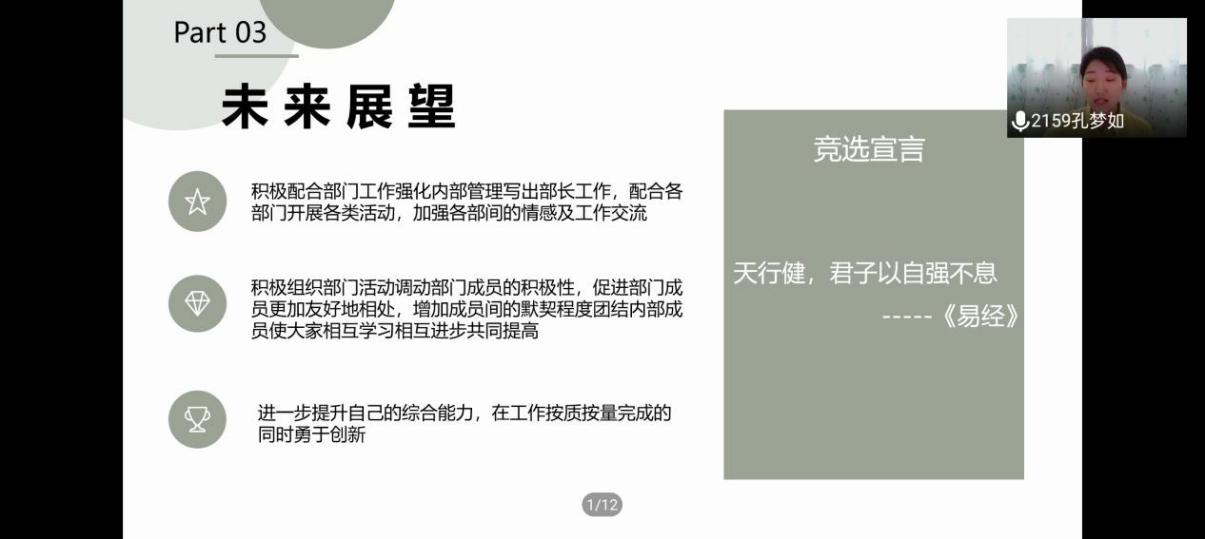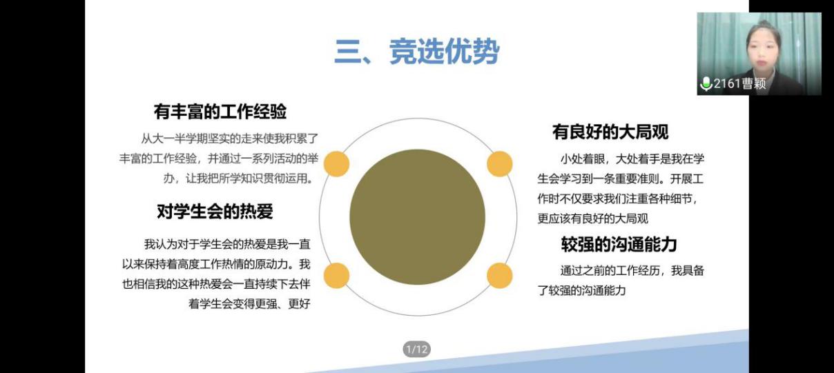 本次大会在慷慨激昂的国歌声中拉开了帷幕。大会共分为五个议程。首先,由学院现任学生会执行主席周璐歆同学向大会作学年工作总结汇报。然后,由学院分团委书记贺茜老师宣读大会候选人、选举人、监票人及计票人的产生办法及具体名单。随即,各位候选人开始进行竞选演讲,演讲内容包括本人竞选优势、对部门认知、对学生会及社团的未来展望等。演讲结束后,进入选举人投票环节。秉承着民主、公平、公正原则,教师和学生代表进行线上投票。经过激烈角逐,学院新一届学生会、社团学生干部产生。