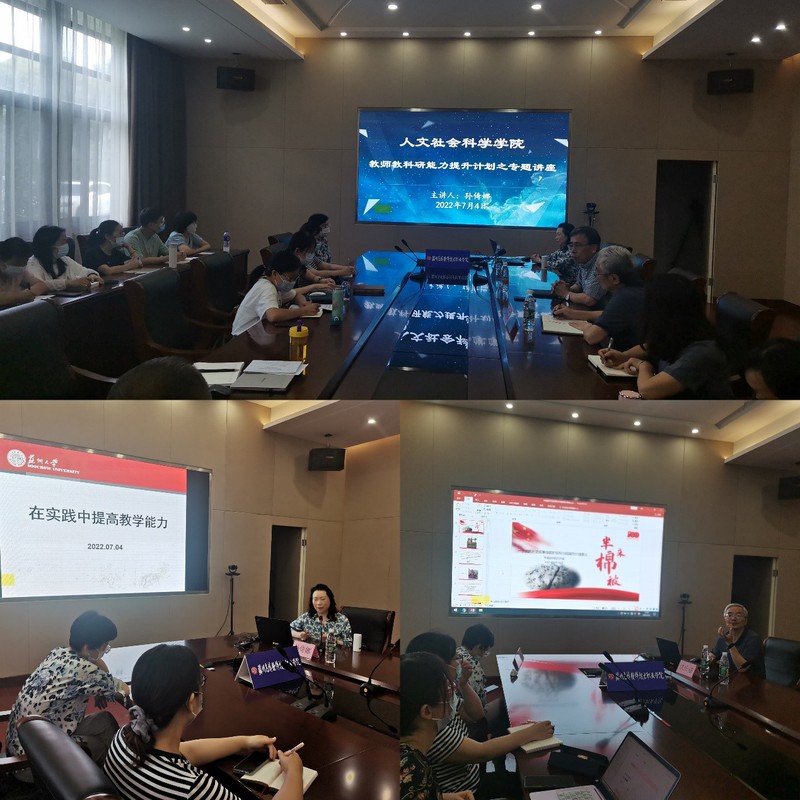 为拓展beat365官网外语教师的教学思路,多维度提高外语教学团队的教科研水平,2022年7月4日下午,人文社会科学学院在行政楼会议室成功举办了“教师教科研能力提升计划”系列活动第二次专题讲座。本次讲座邀请了教育部大学外语教学指导委员会委员、江苏省教学名师、苏州大学外国语学院教授孙倚娜和beat365官网特聘教授洪庆福两位担任主讲,外语系全体教师聆听了讲座。讲座由校长助理兼人文社会科学学院院长黄兴主持。