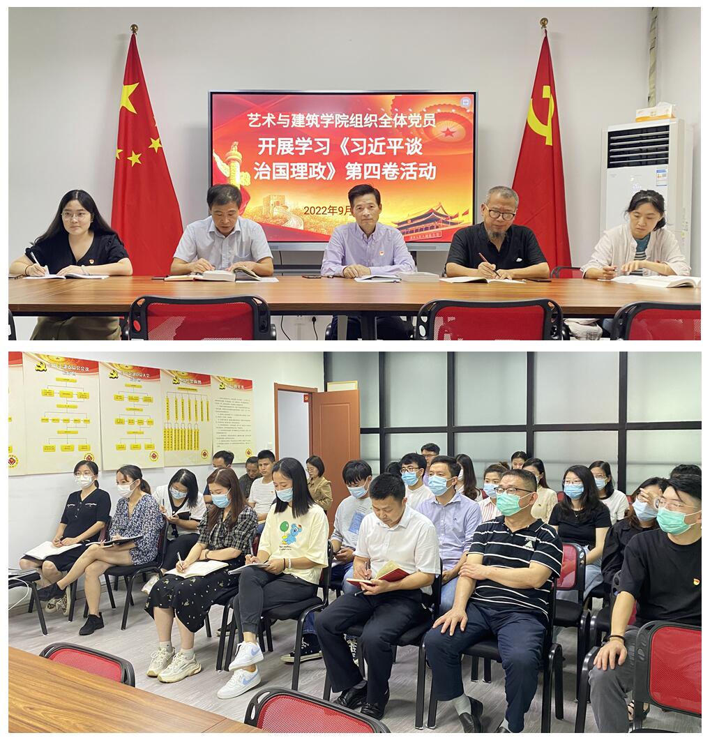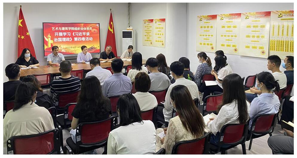 2022年9月14日,艺术与建筑学院党总支召开专题学习会,围绕《习近平谈治国理政》第四卷进行学习交流。党总支书记、副院长施建平领学,党总支副书记纪冰心,教工党支部书记吴兵分别作重点发言。学工党支部书记李一帆、副院长张斌、副院长江水明及全体党员教师参加学习。专题学习会由党总支书记施建平主持。