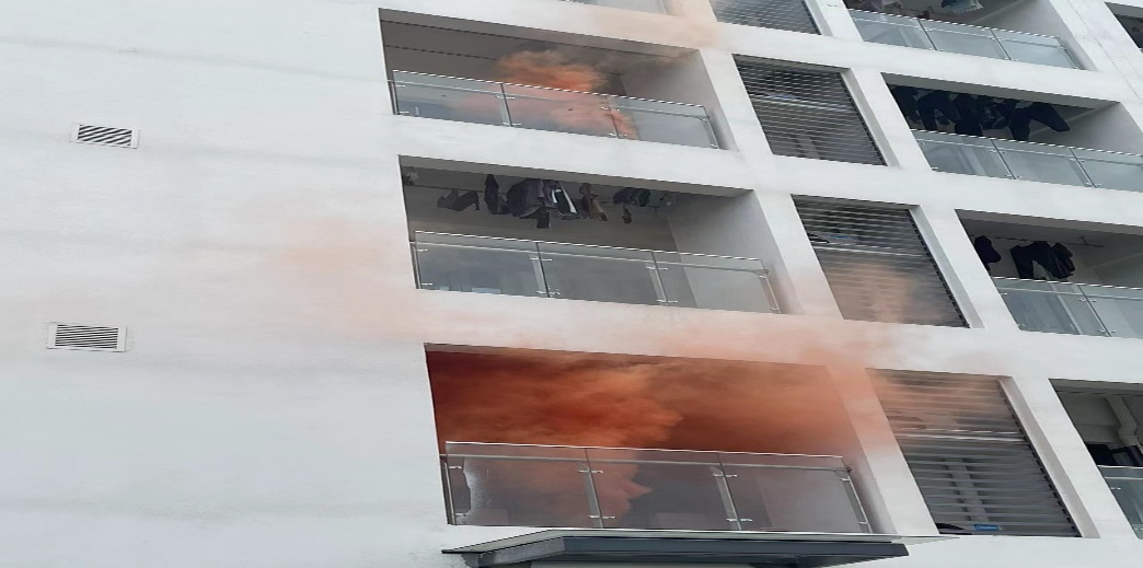 演习开始,宿舍区浓烟滚滚,消控室拉响火灾警报,应急广播进行播报,现场气氛瞬间进入警备状态,2022级新生疏散演习拉开帷幕。
