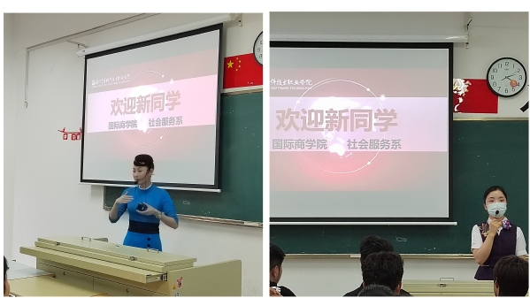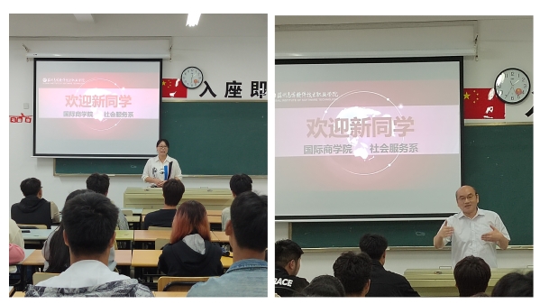 社会服务系副主任李东娇老师代表社会服务系全体教师对新生的到来表示热烈的欢迎,并介绍了社会服务系的整体概况。社会服务系主任魏向东教授对新生表达了美好祝福和殷切期盼,希望同学们都能成为素质卓越、品德高尚、全面发展的高素质技能人才。