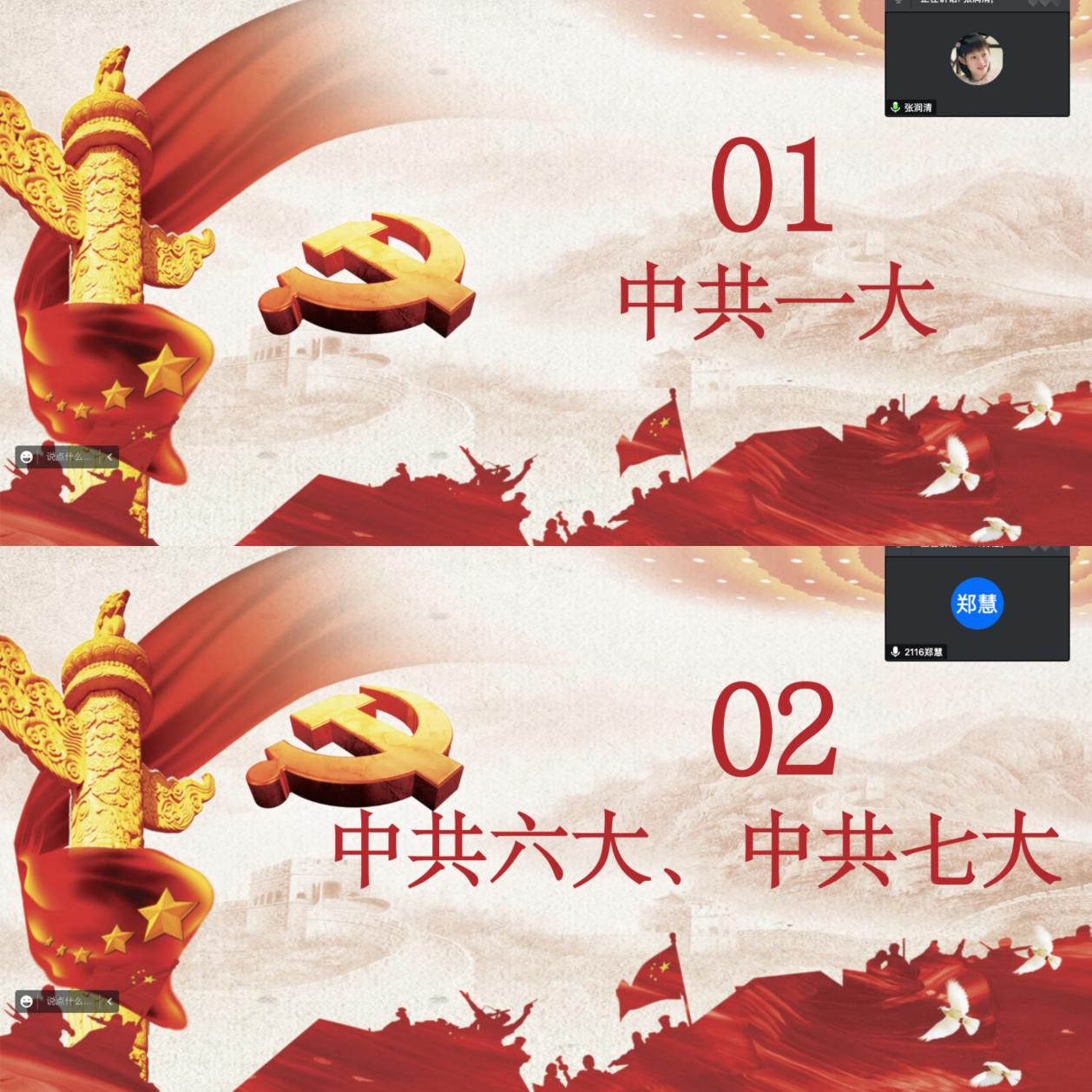 会议伊始,由发展对象代表张润清同学对中共一大简单叙述,她说:“中国共产党始终把为中国人民谋幸福、为中华民族谋复兴作为初心和使命。同学们请坚信,中国共产党将不断改变未来,推进人类社会迈向更加光明美好的明天,以奋斗者之蓬勃姿态迎接党的二十大胜利召开”。紧接着机电工程学院团委学生会主席团代表郑慧同学对中共六大和七大进行概括,她讲:“作为新时代的青年要担负起历史的责任,接好历史的接力棒,在不懈奋斗中,磨练本领,砥砺前行”。