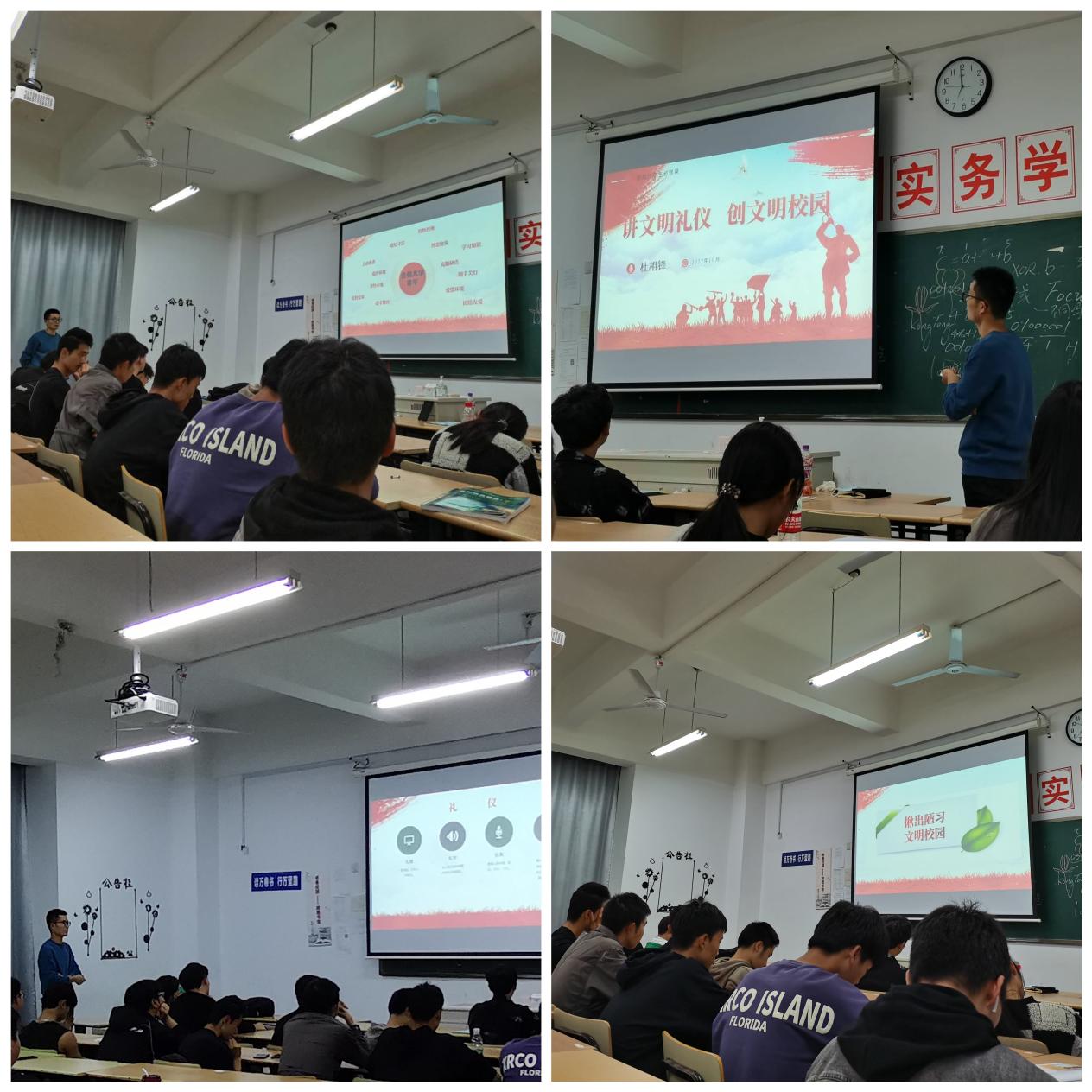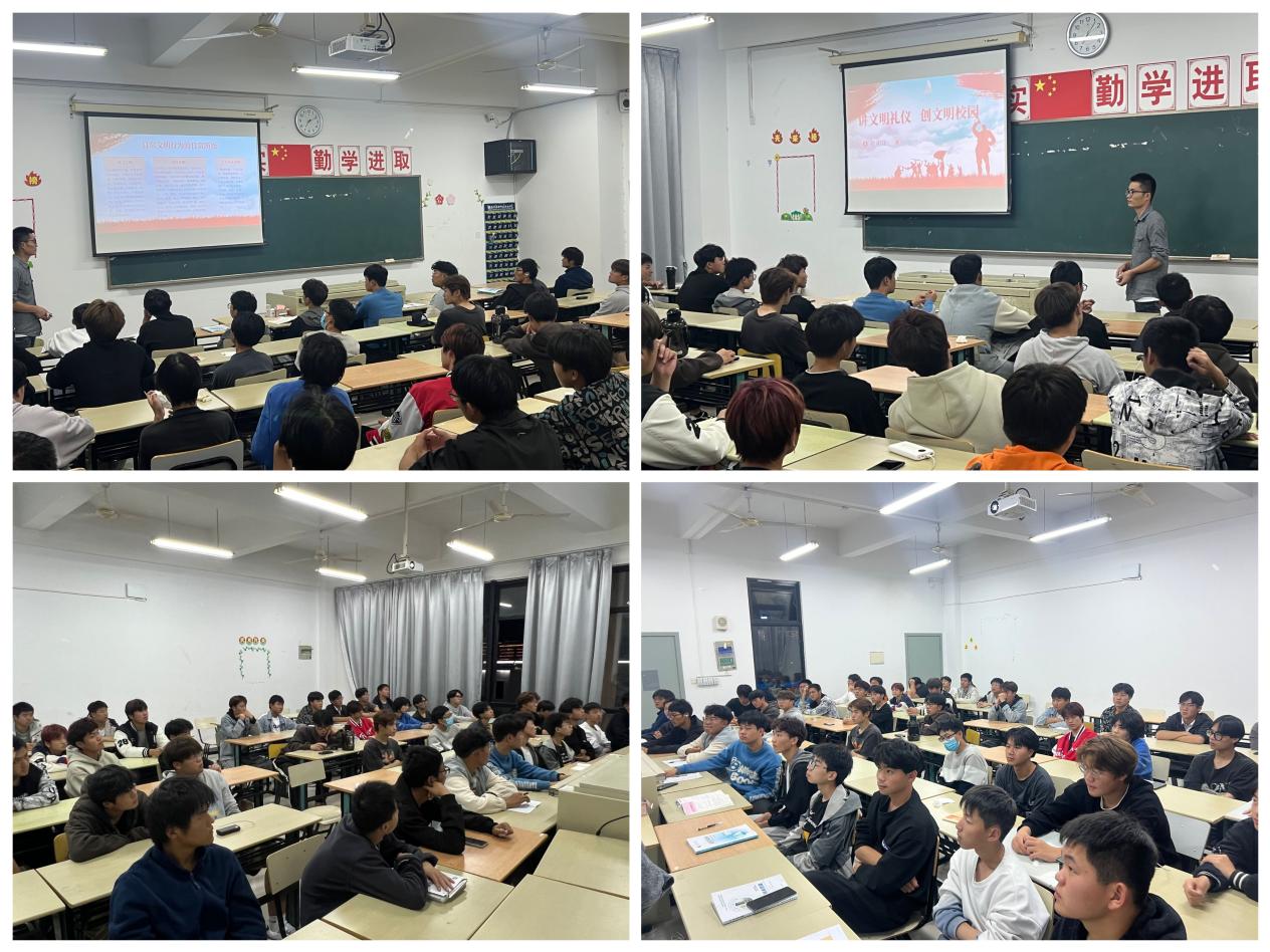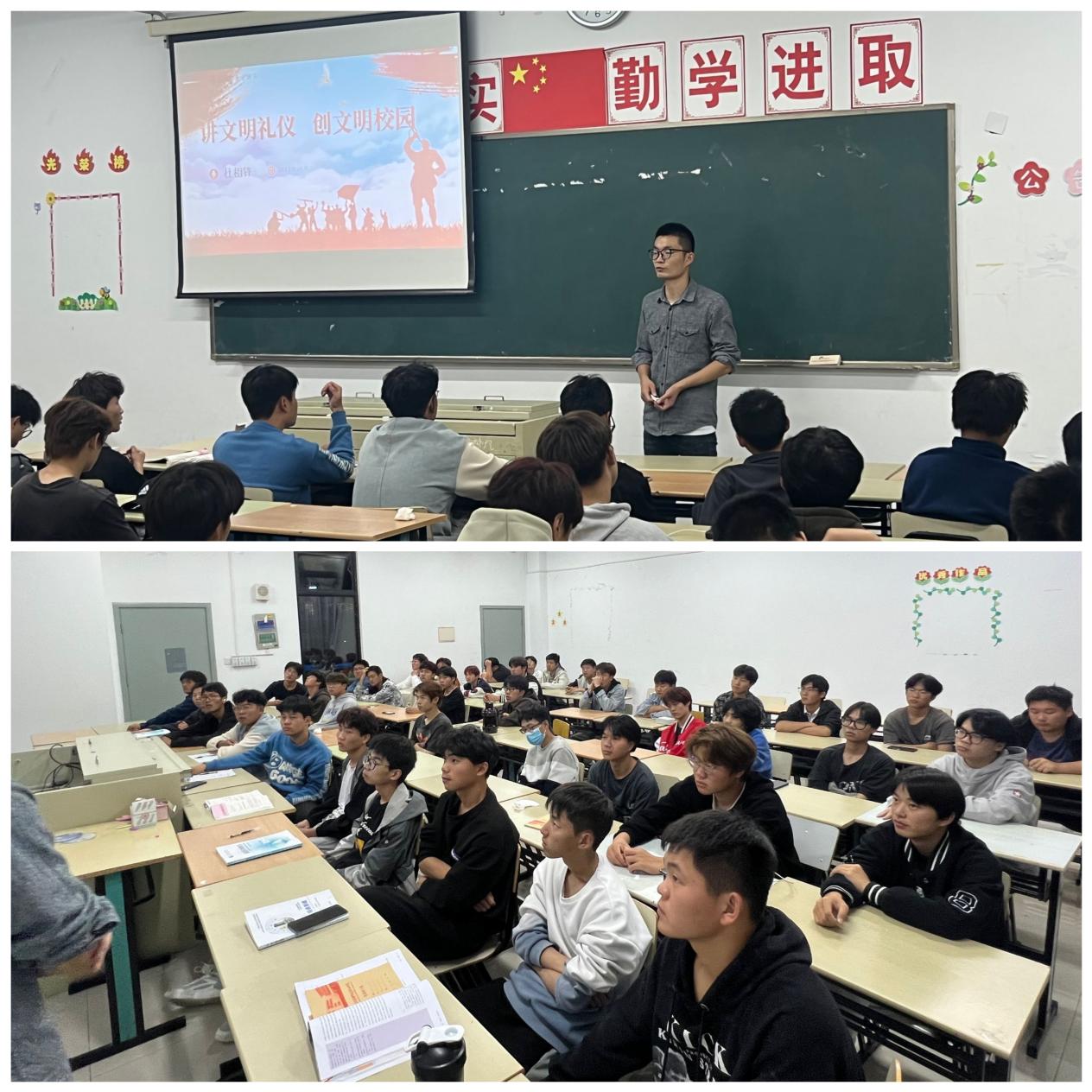 为积极响应学校“青春献礼二十大,强国有我新征程”主题系列活动,帮助学生增强文明礼仪知识、树立文明礼仪意识、践行文明礼仪行为、养成文明礼仪习惯,促进学生身心健康发展。机电工程学院大一辅导员杜相锋老师认真寻找素材资料并积极准备课件,于2022年10月11日至10月20日在晚自习教室组织大一新生开展了机电工程学院“争做文明学生,创建文明校园”主题教育班会,共计5场。采用小班化、互动形式,辅导员发挥引领作用,促进学生积极参与主题教育班会,学会思考、提升文明礼仪素养、制定学习目标、激发学习主动性。