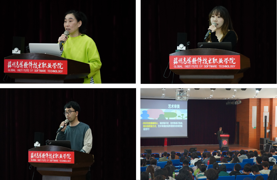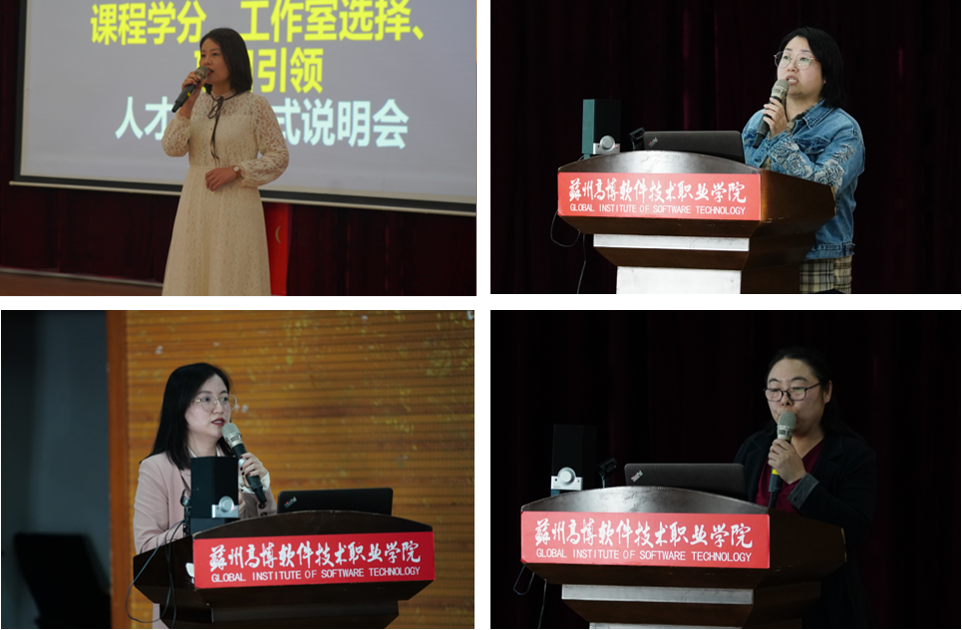 随后,新媒艺、新视界、建筑工程咨询、博创公共艺术、匠新、苏园六大工作室主任结合专业介绍了工作室教学运行模式,展示了历届优秀项目,使同学们了解“项目”是什么,“项目”和课程有什么关系,在当前课程中“项目”是如何融入的,并带领同学们展望未来就业方向和对口工作岗位。
