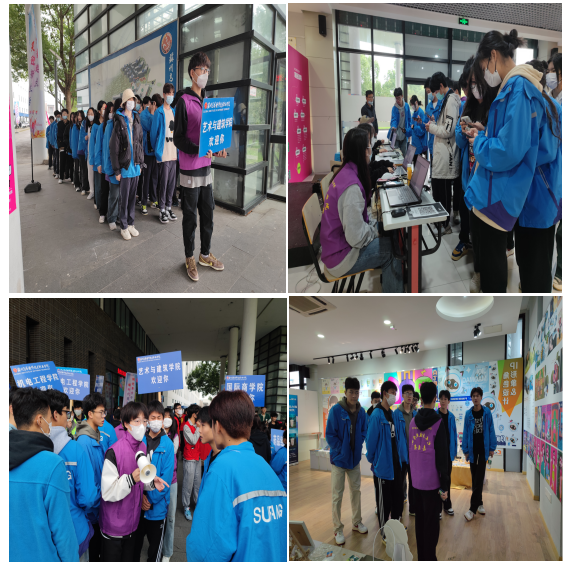 图为迎接新生进行信息登记、组织学生参观艺术展厅现场