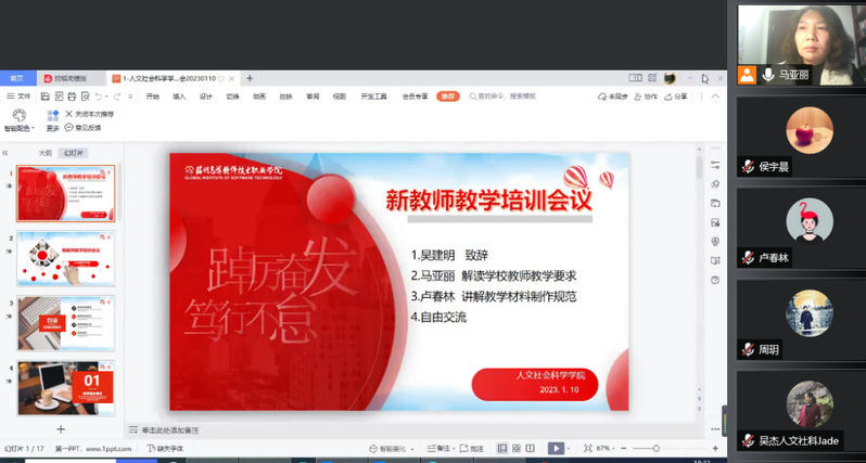 为了让新入职教师全面了解学校及我院建设和发展情况,提前熟悉教学流程和教学规范,明确岗位职责和教学要求,更好地融入学院大家庭,人文社会科学学院于1月10日召开新入职教师线上培训会议。会议由分管教学副院长马亚丽主持,学院党总支书记吴建明、院长助理卢春林、院办公室主任侯宇晨及全体新入职教师参加了会议。