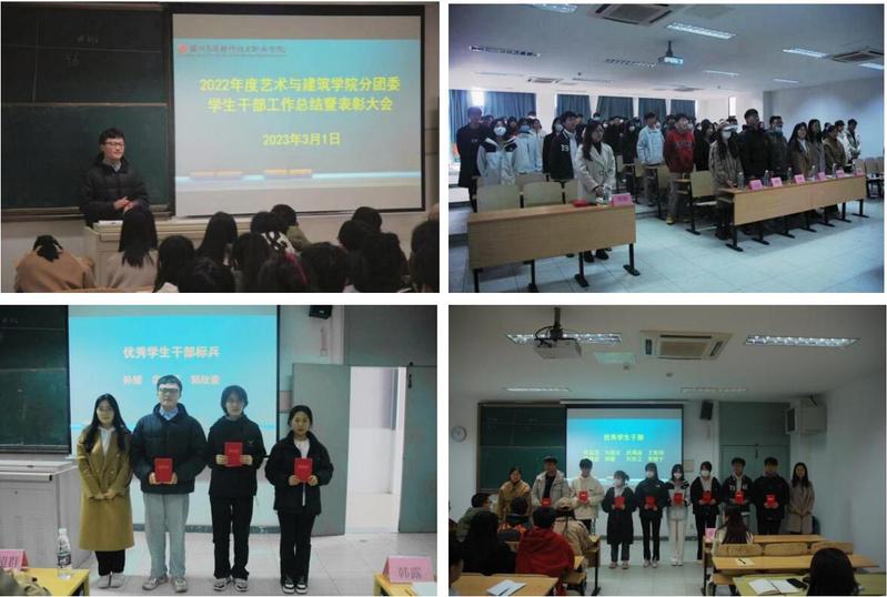 为表彰先进,树立典型,激励新一代大学生德智体美劳全面发展,充分发挥学生干部的带头作用,在艺术与建筑学院党总支领导关心支持下,3月1日下午,艺术与建筑学院分团委在12-207教室顺利召开2022年度学生干部工作总结暨表彰大会,全体辅导员老师、院学生会、艺术团以及青年学习社的成员参加会议。会议由郭欣豪同学主持。